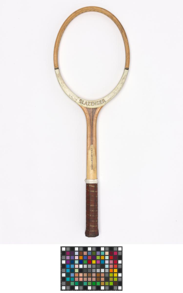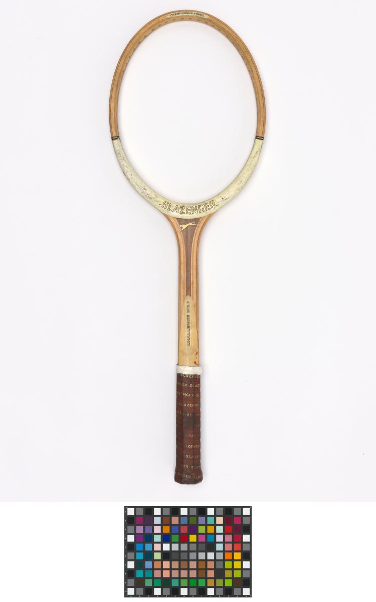 Oval frame with concave wedge. Leathered octagonal handle. Leather butt cap. Missing strings. Legend: "Championship frame" and "Slazenger rackets have won more Wimbledon titles than any other make" + "J.Soler". Manufacturer's decal: a black panther.