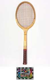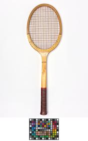 Oval frame with concave wedge. Leathered octagonal handle with leather butt cap. Horizontal strings with a few rows of additional cross strings at the upper and lower end of the string bed. Laurel wreath. Retailer's ? decal: rubed out, caption: [?] Gibraltar.