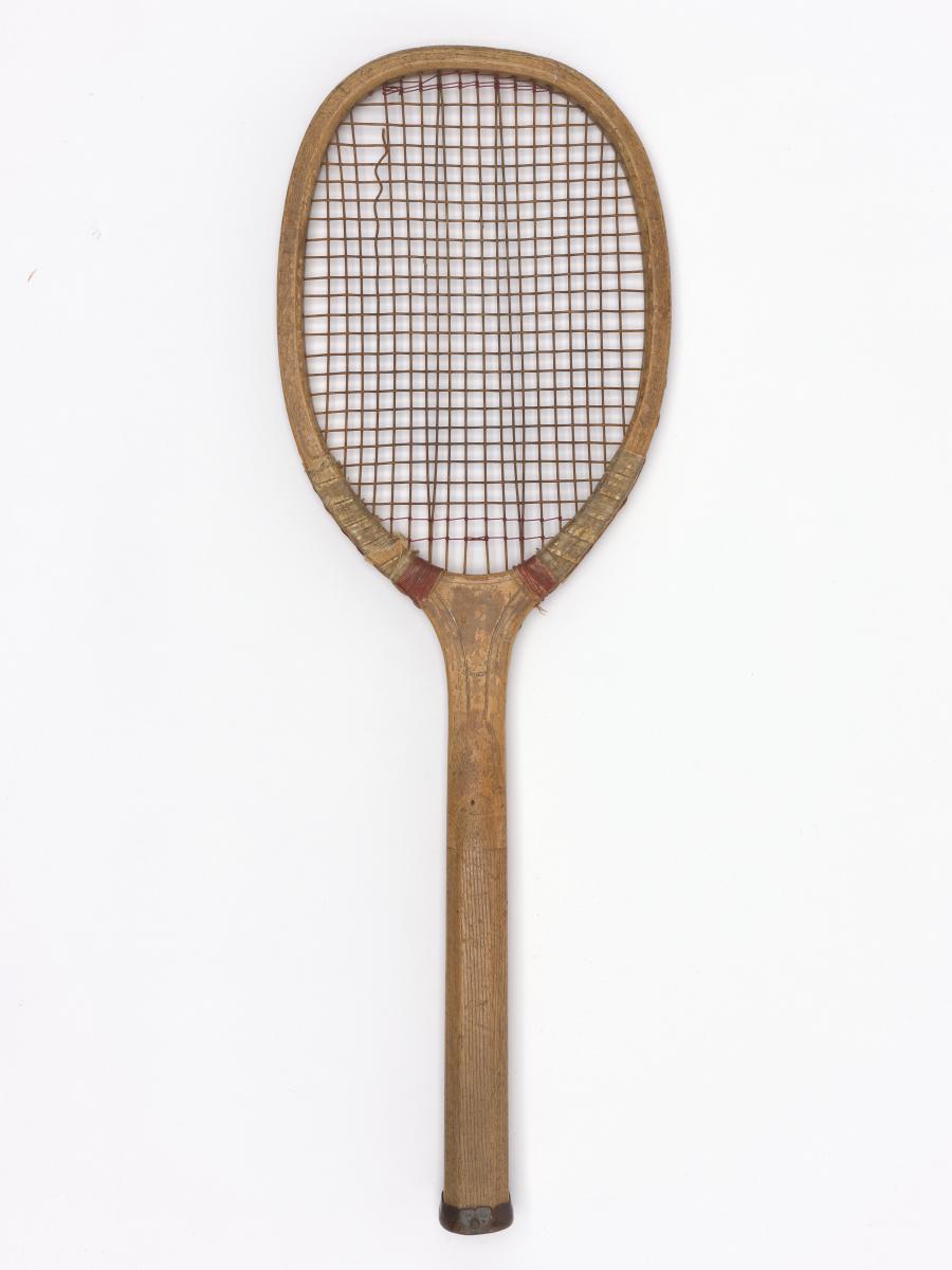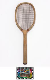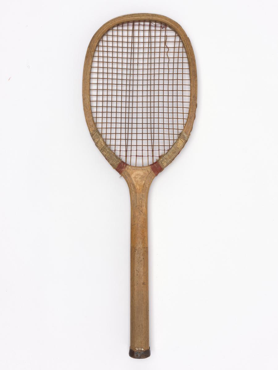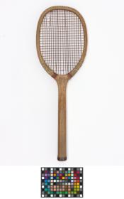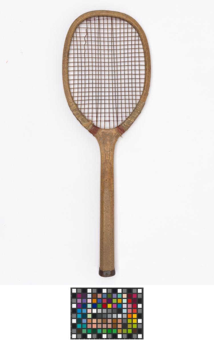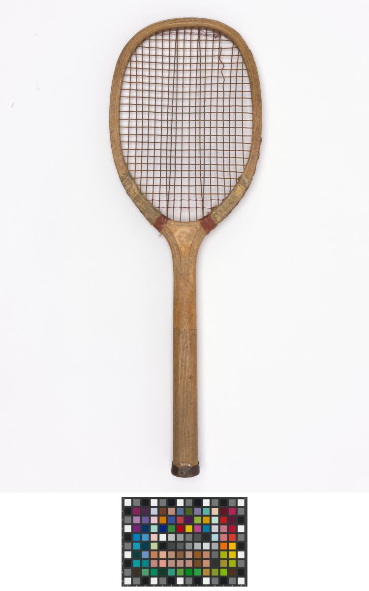 Elliptical frame with concave wedge. Fine-grooved octagonal handle. Leather butt cap. Horizontal strings with a few rows of additional cross strings at the upper and lower end of the string bed. Model's decal erased.