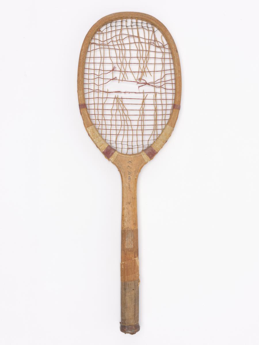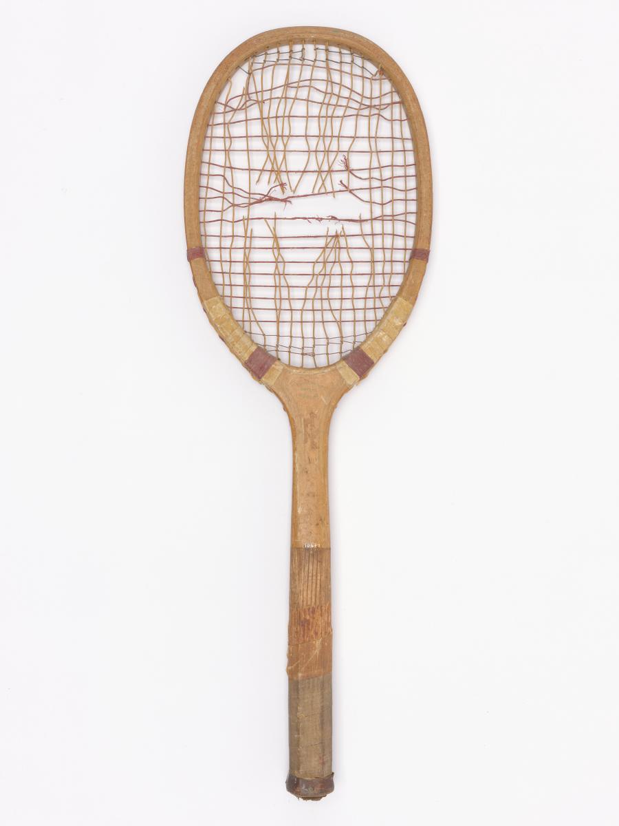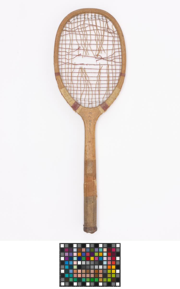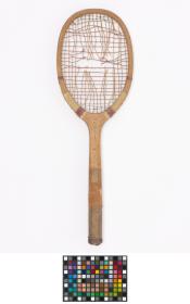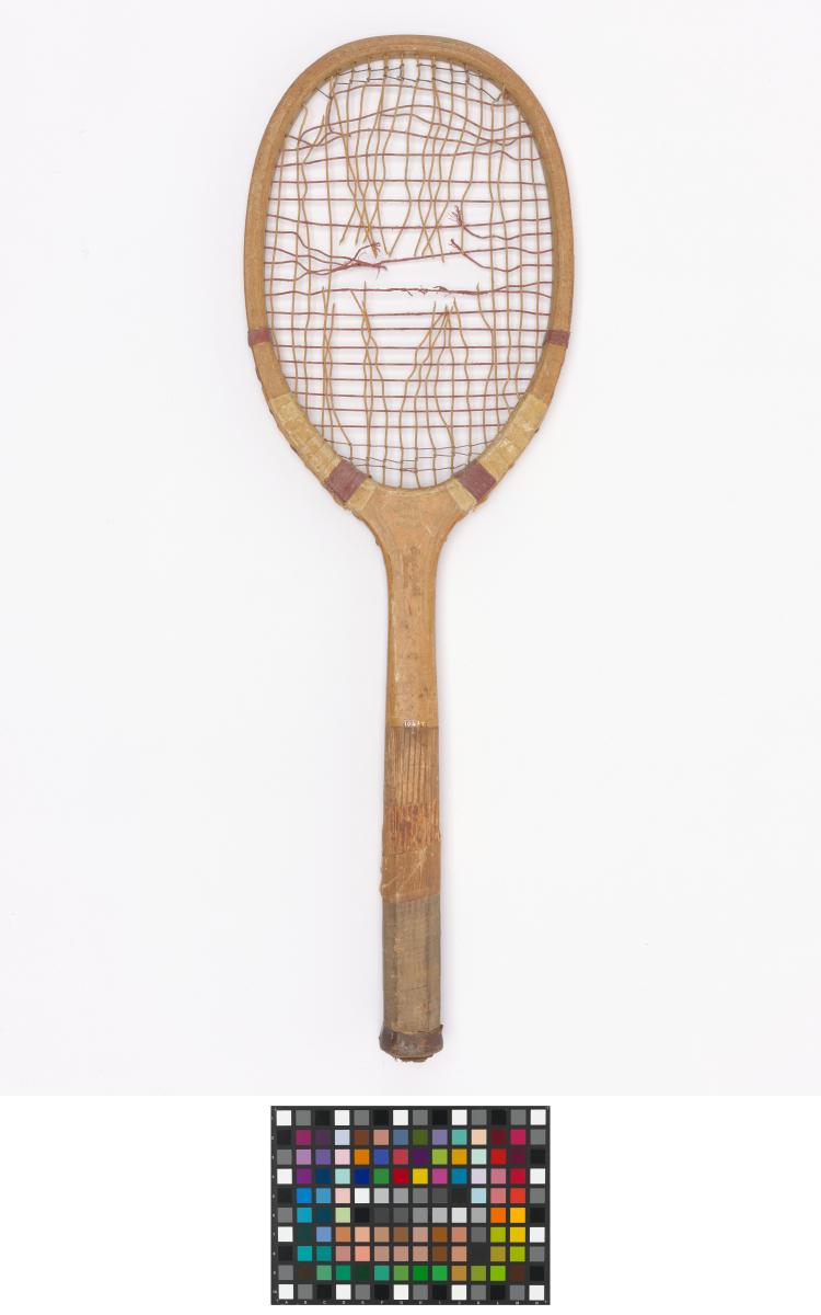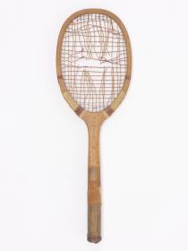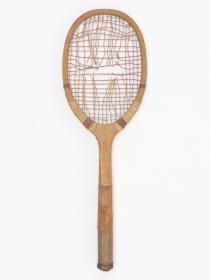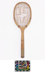 Oval frame with concave wedge. Deep-grooved octagonal handle covered by a cloth. Leather butt cap. Horizontal strings with a few rows of additional cross strings at the upper and lower end of the string bed.