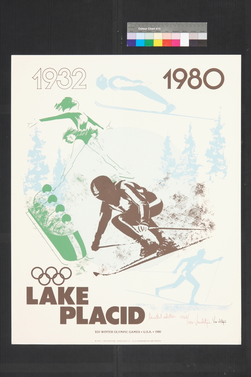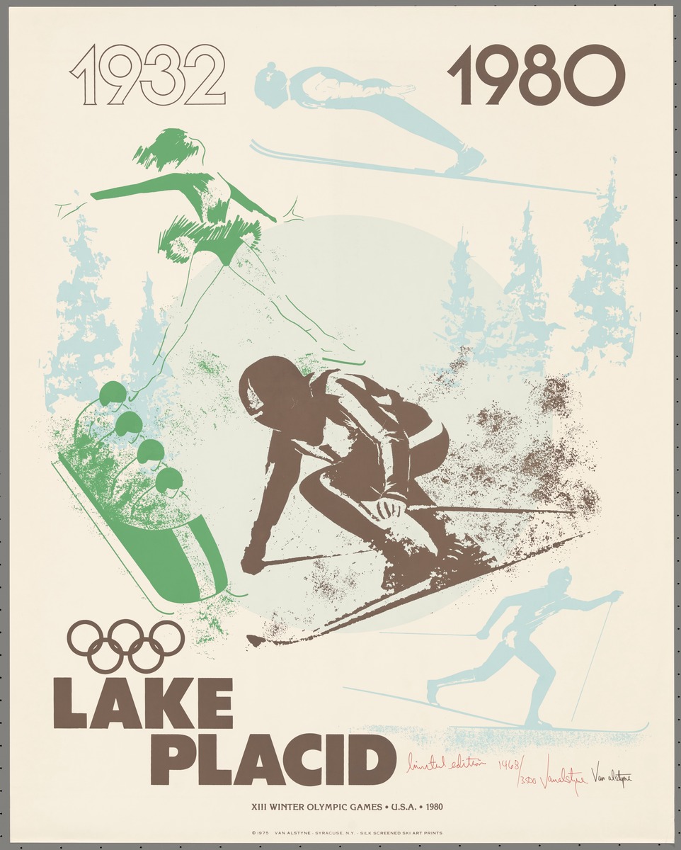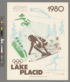 Poster with five winter sports. Caption: "1932 1980. Lake Placid. XIII Winter Olympic Games. USA, 1980". Signed by the artist.