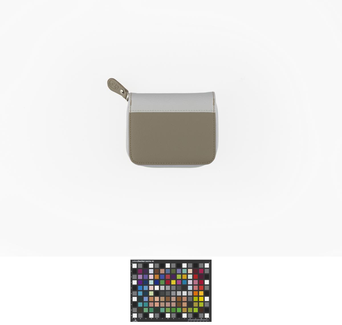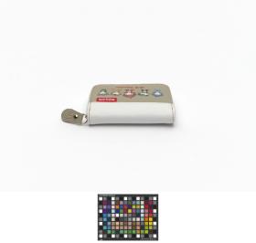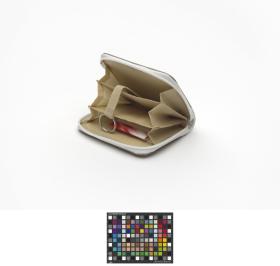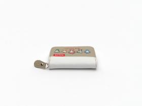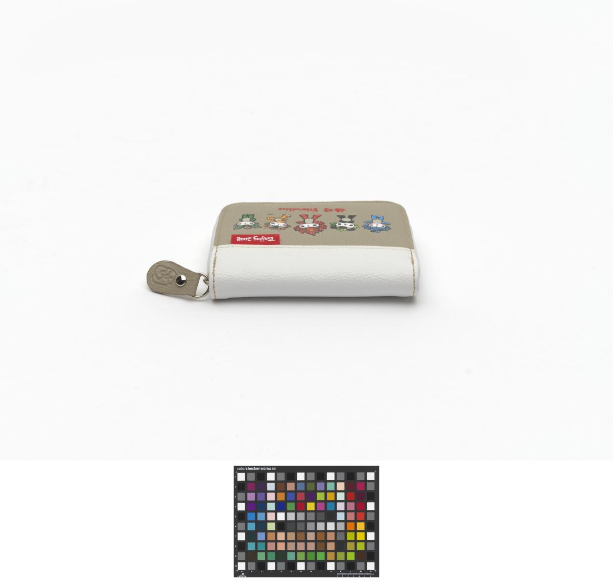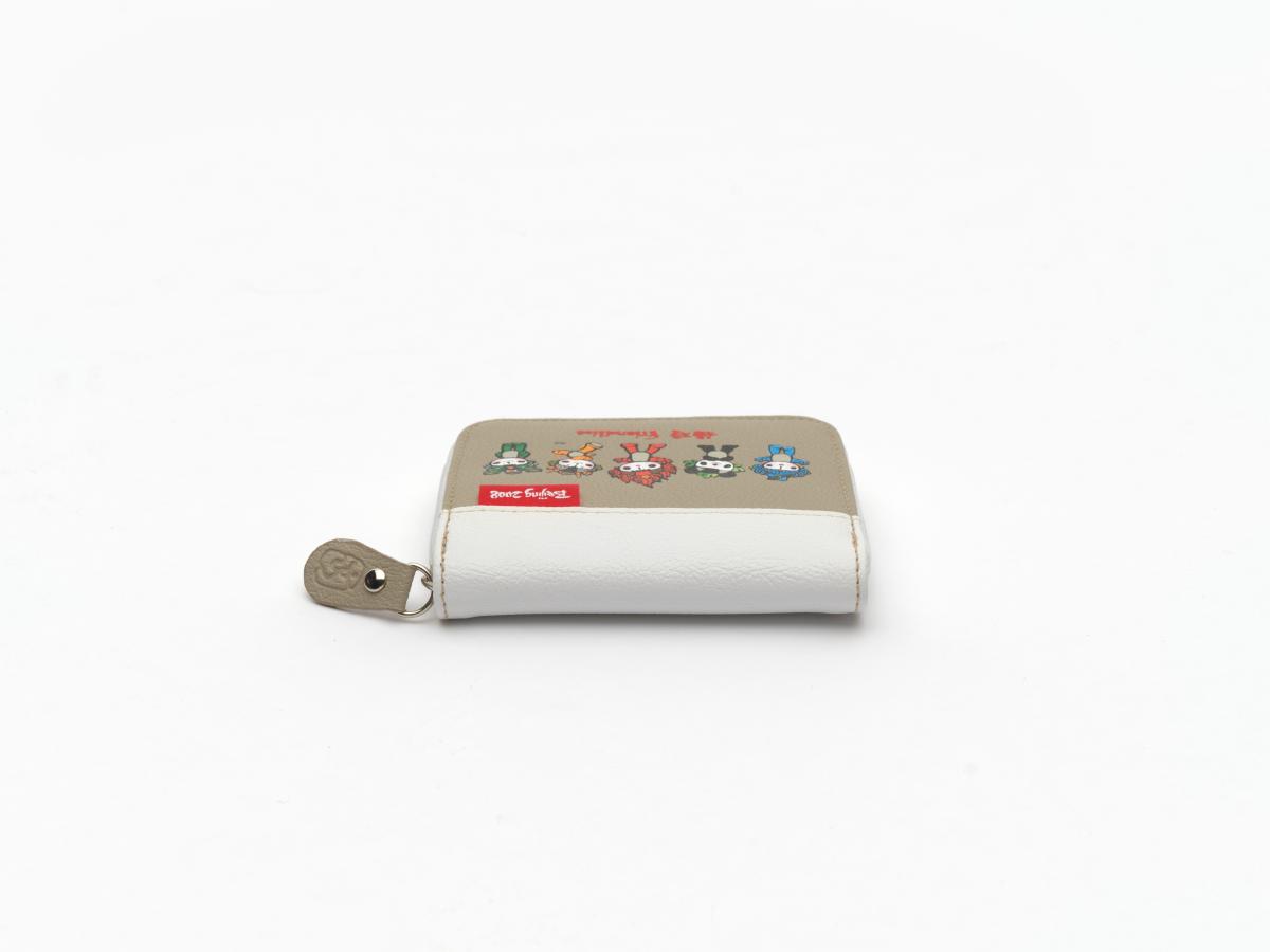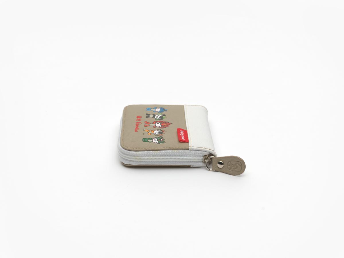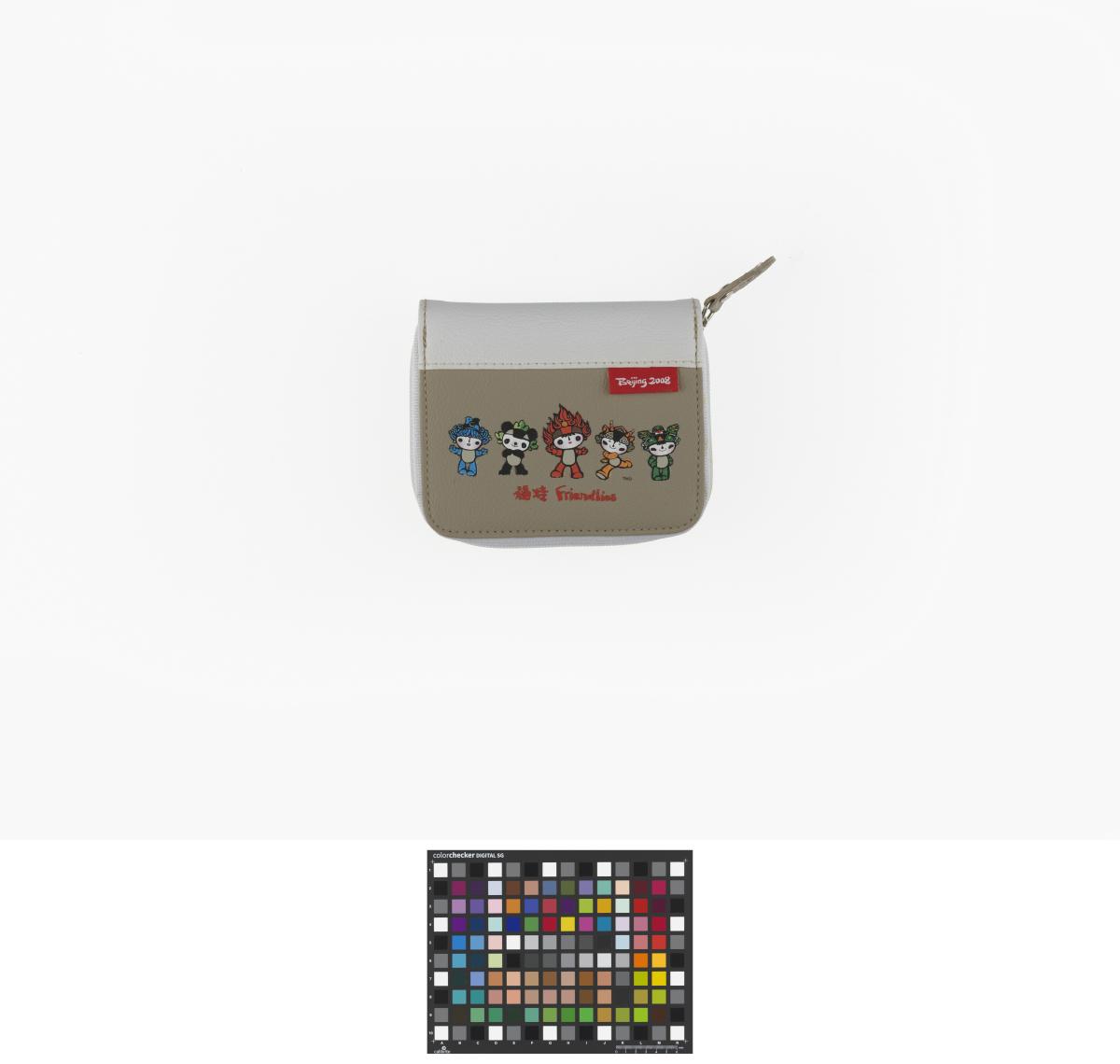 White and beige purse with the five mascots of the Games. Caption: "Friendlies". Red label with caption: "Beijing 2008".