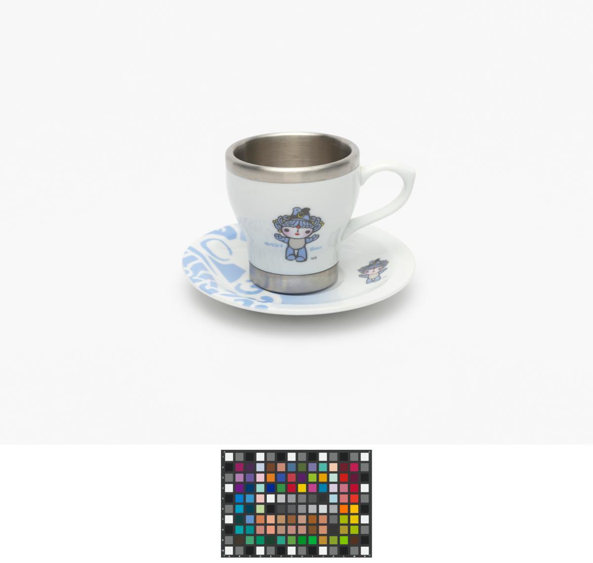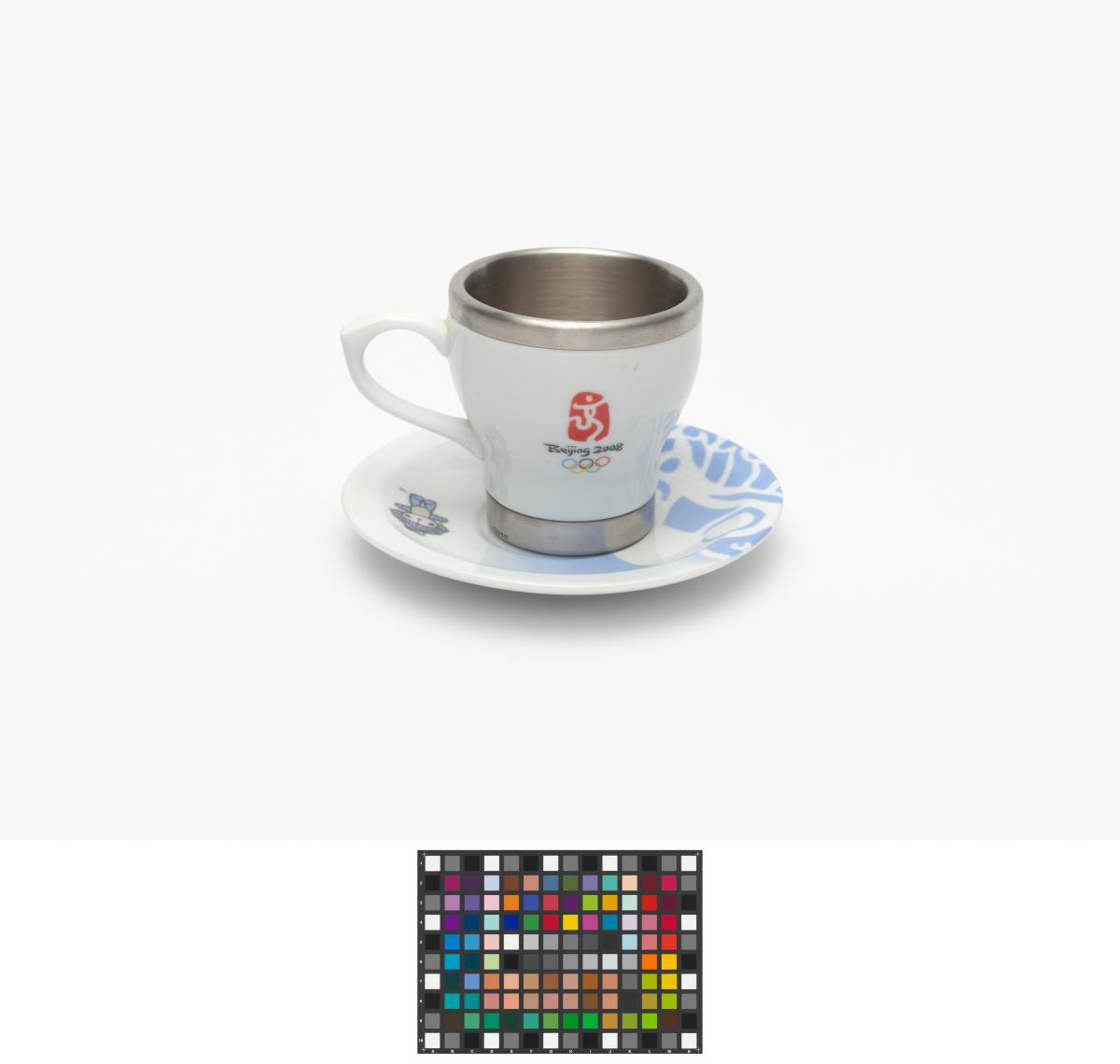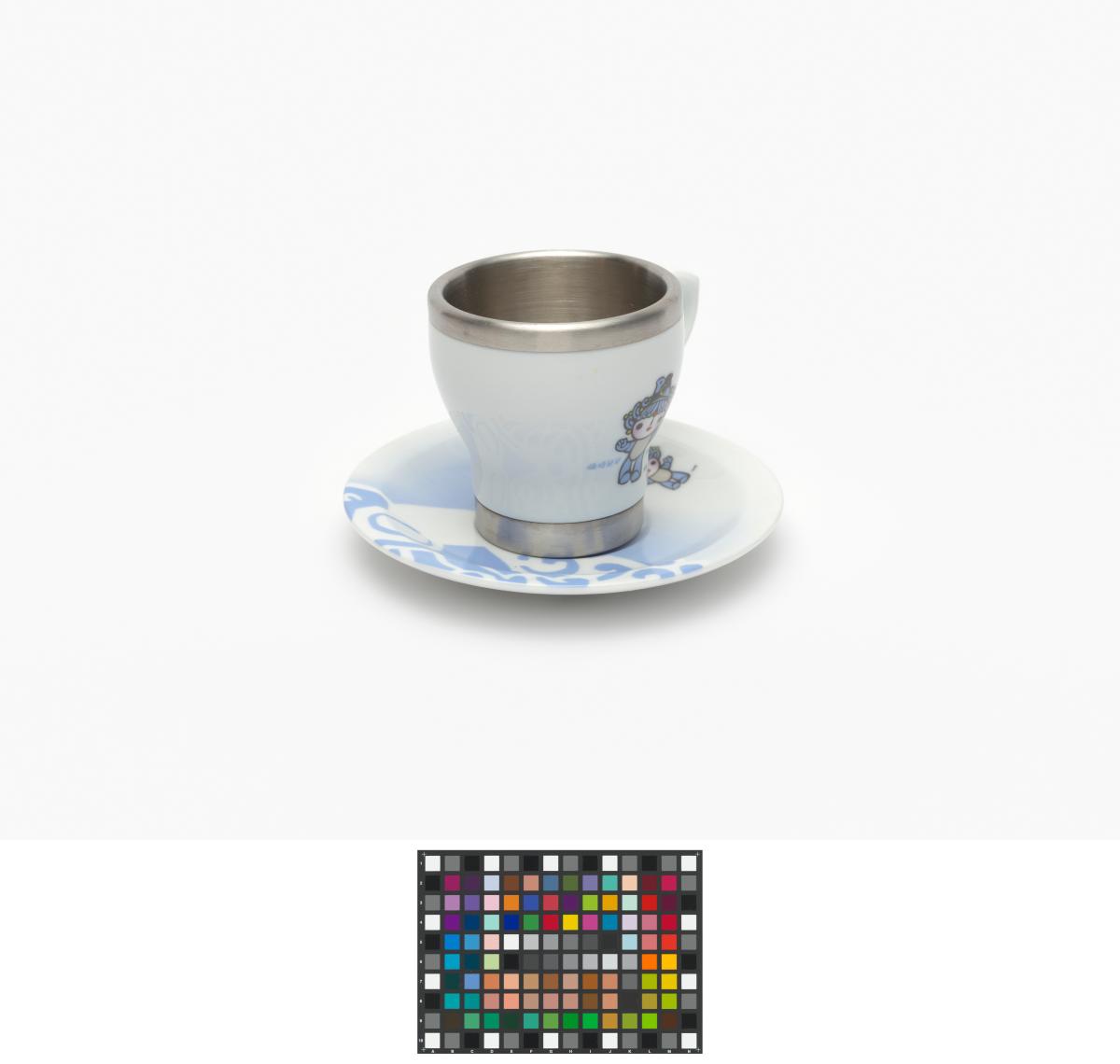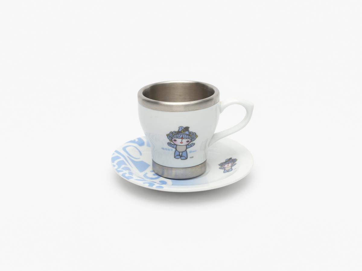 Porcelain and aluminium cup and saucer. One one side, Beibei, one of the Games' mascots, on the other side, Emblème of the Games.