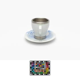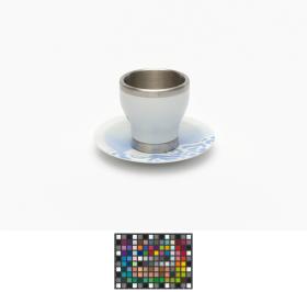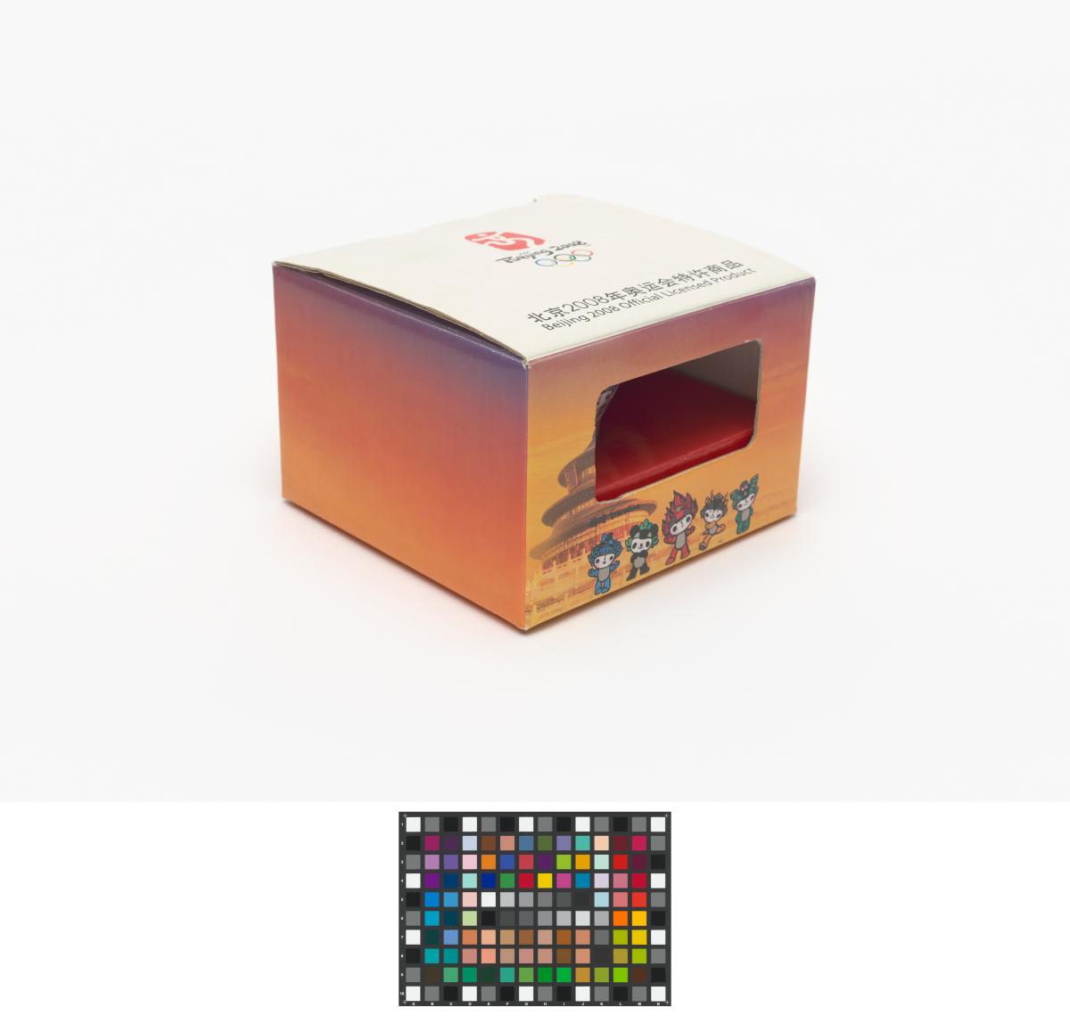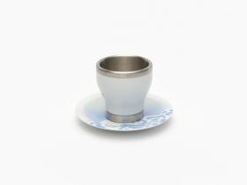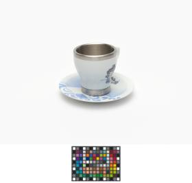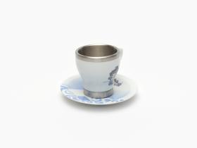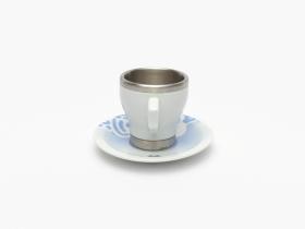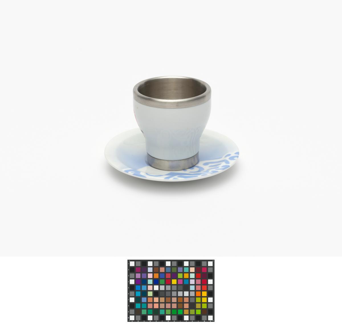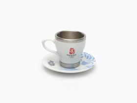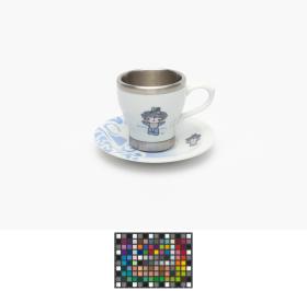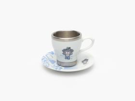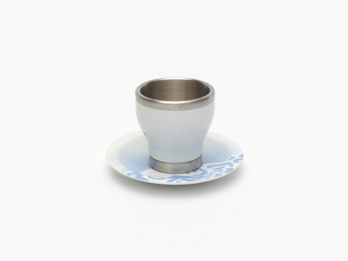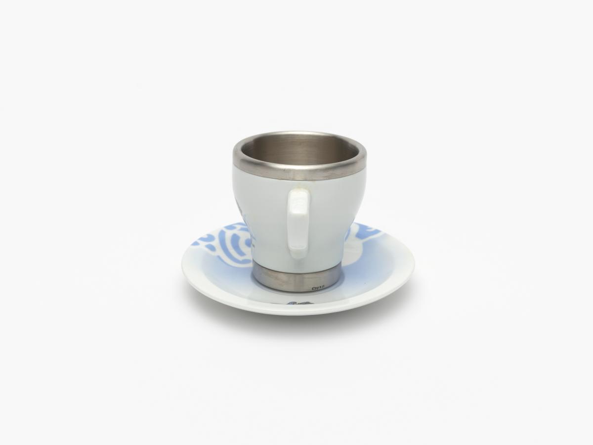 Porcelain and aluminium cup and saucer. One one side, Beibei, one of the Games' mascots, on the other side, Emblème of the Games.