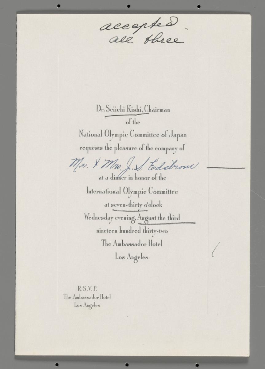 Los Angeles 1932, invitation to the reception given by the Dr. Kishi Seiichi.