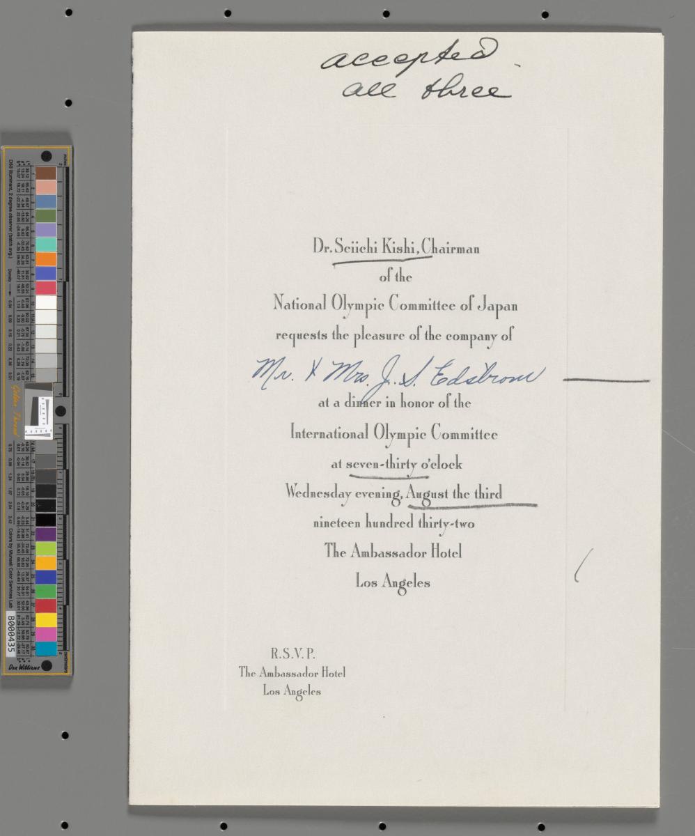 Invitation to the reception given by Kishi Seiichi to the IOC, adressed to Mr. and Mrs. J.S. Edström.