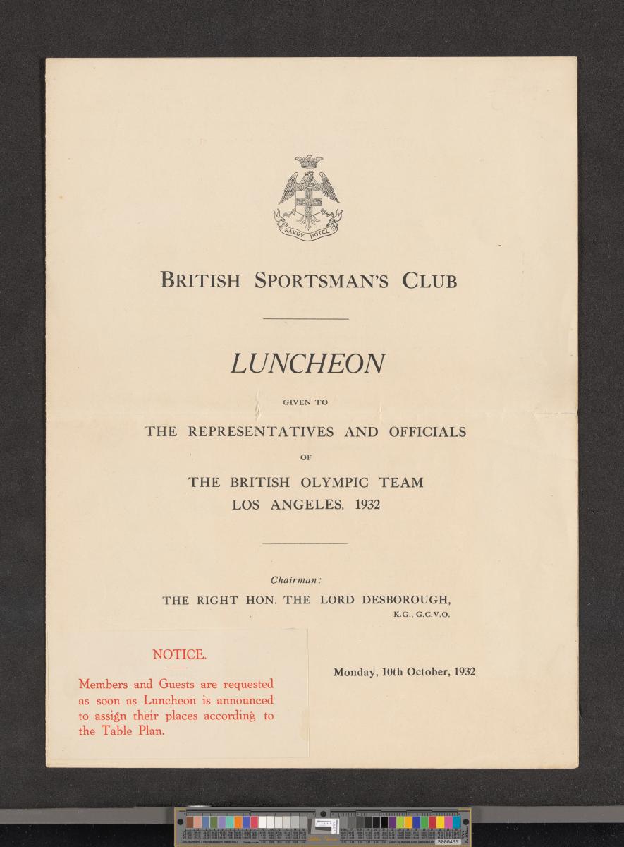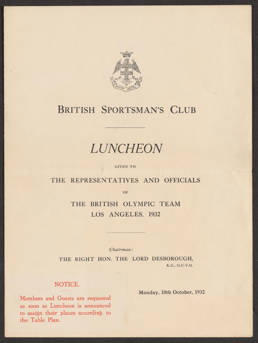 Table plan of the luncheon given by the British Sportsman's Club to the representatives and officials of the British Olympic Team, on OIctober 10, 1932. Arms of the hotel above.
