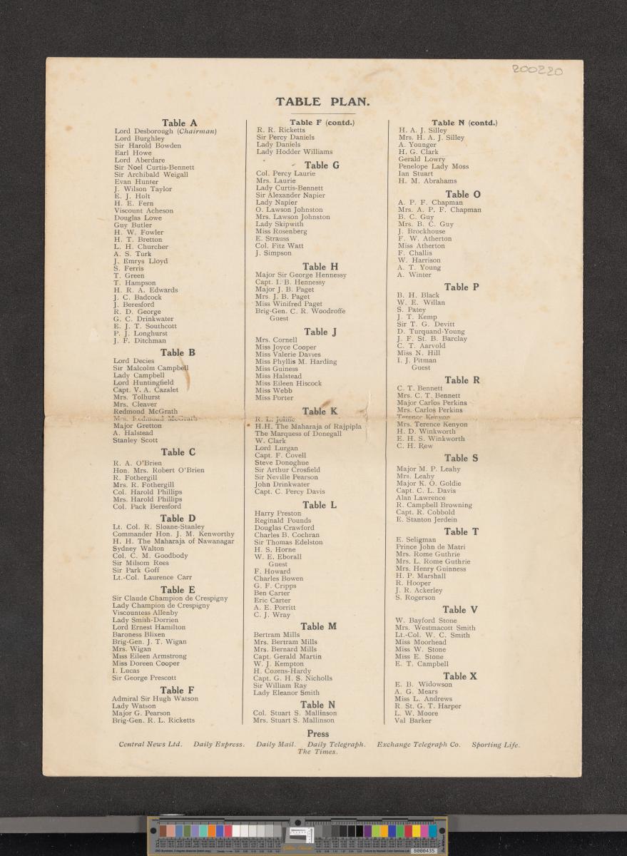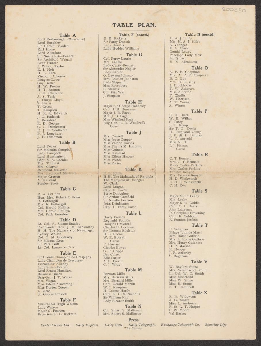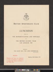 Los Angeles 1932, table plan of the luncheon given by the British Sportsman's Club to the British Olympic team.