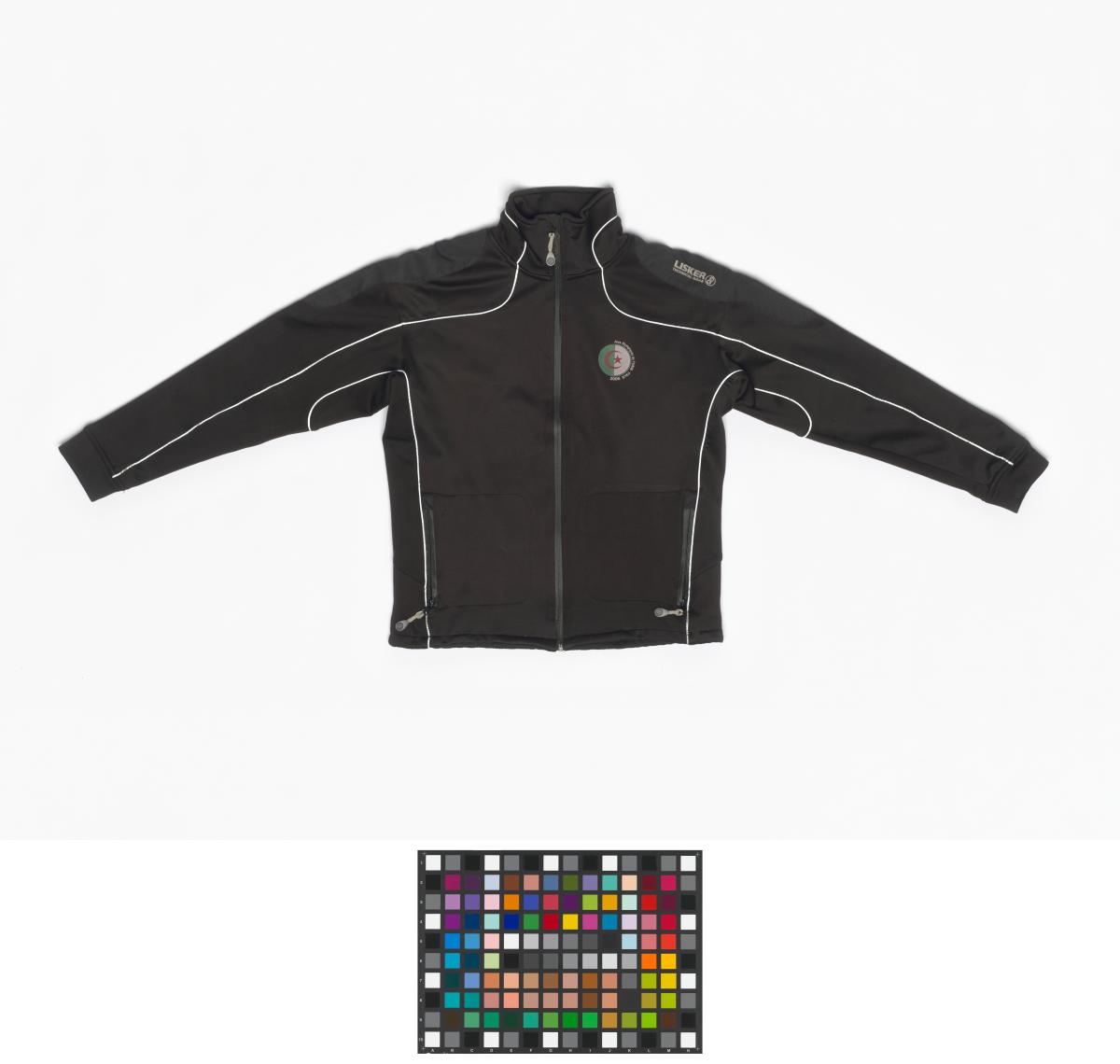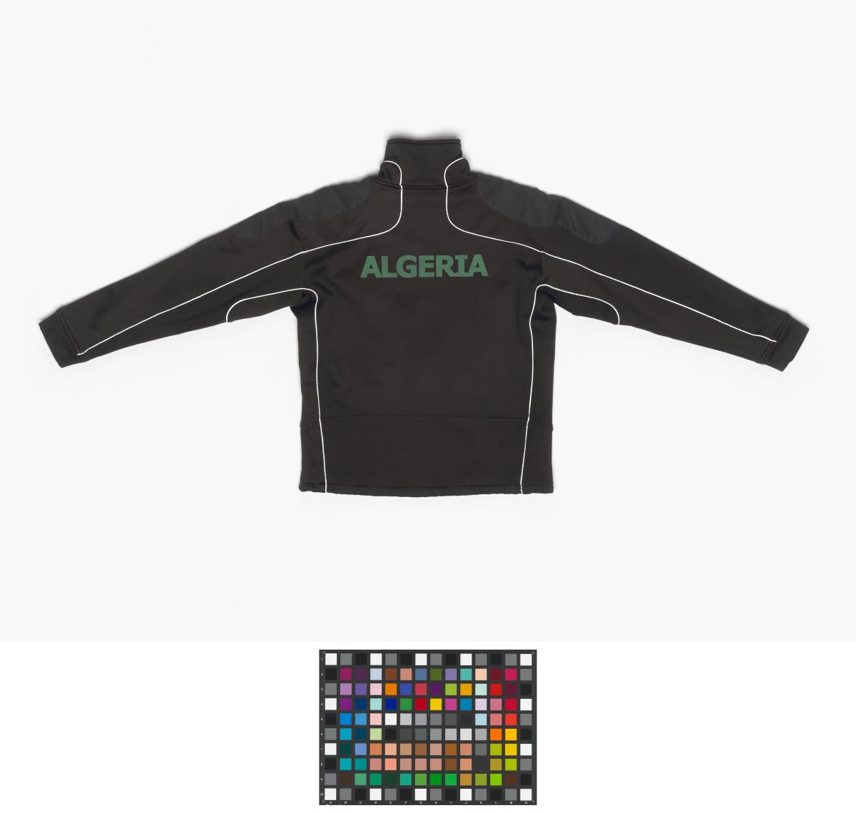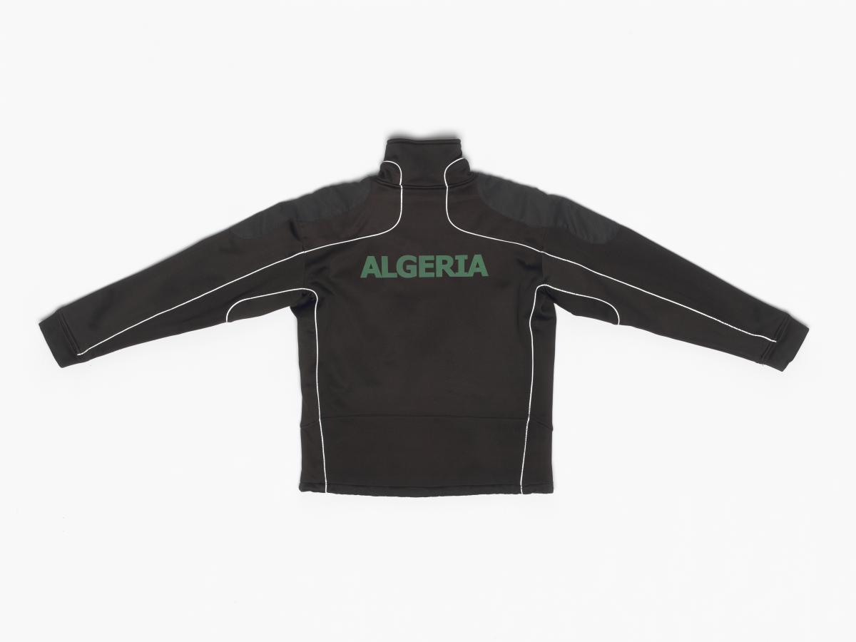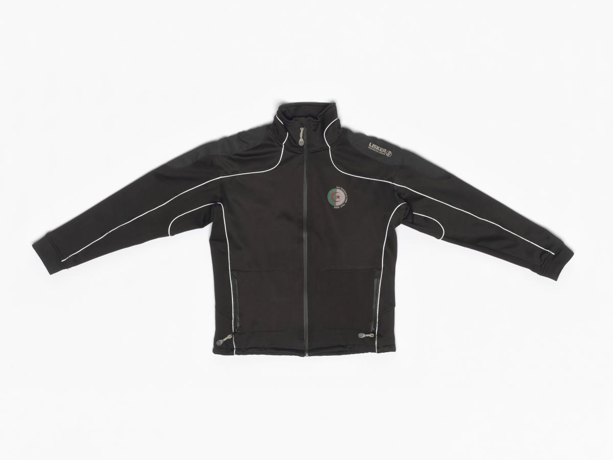 Uniform's black jacket from the Algerian delegation. Algerian flag with the caption: "Jeux Olympiques de Turin Italie 2006" on the chest and the caption: "Algeria" in the back. Size M.