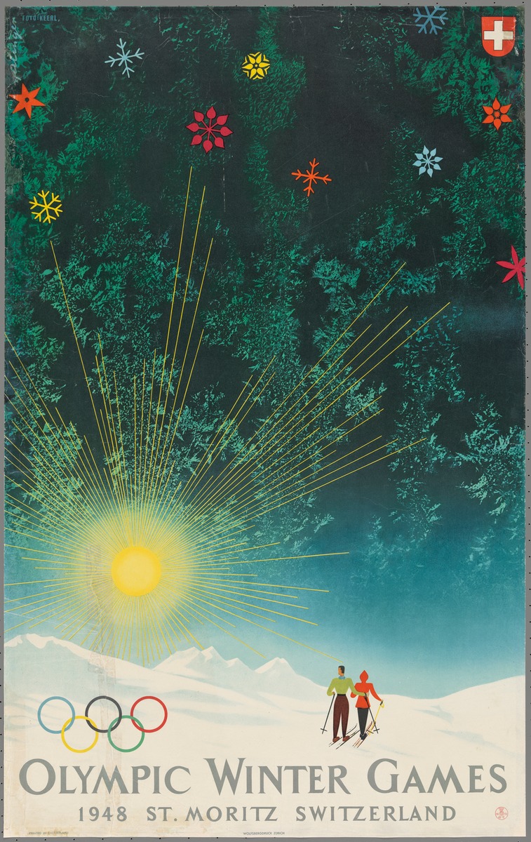 Supporting the theory of a tourism message, aside from the clear tourism poster style, is the fact that this poster was issued by the SNTO (Swiss National Tourist Office) in both an Olympic and non-Olympic form. Thus a pure travel poster, using the exact same design, was issued at the same time in 1948 with the text “Vacances en Suisse” (Vacation in Switzerland). This was not by chance, as the President of the Commission for Propaganda and Advertising for the St. Moritz Organizing Committee was also Director of the Swiss National Tourist Office.