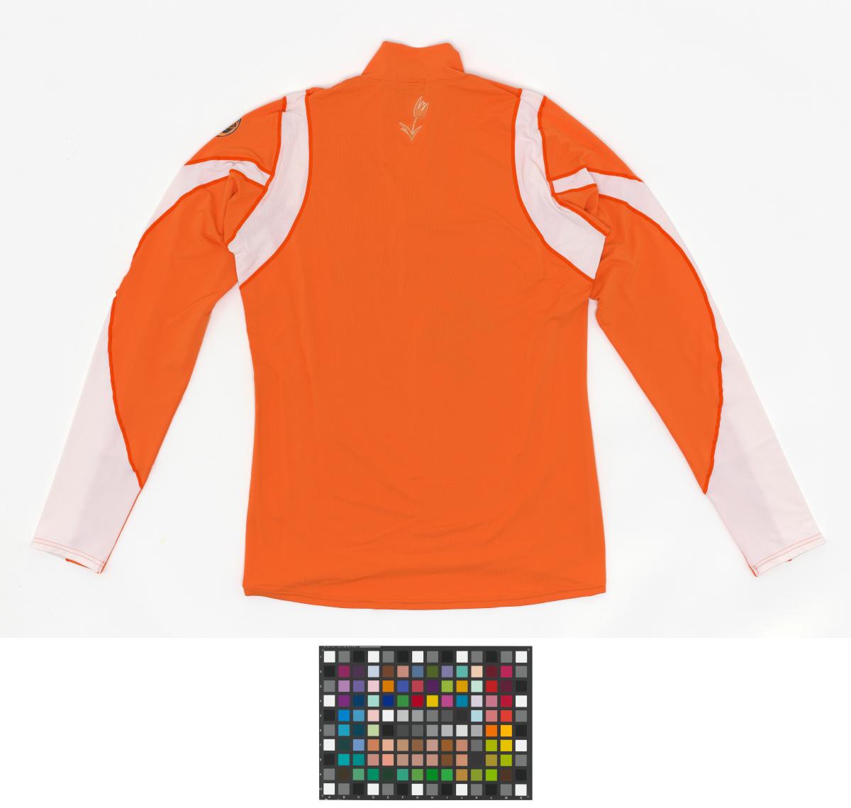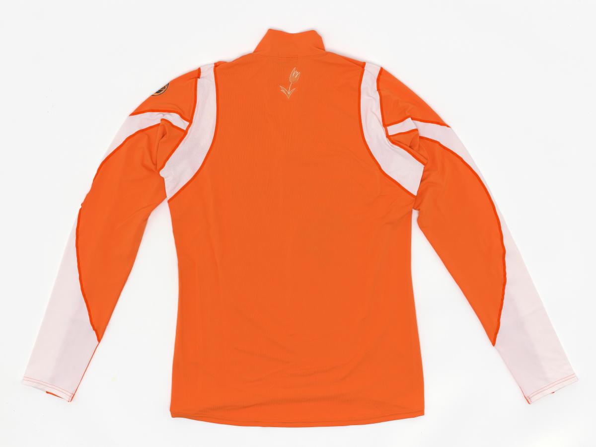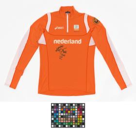 Shirt with the logo of Asics, the NOC from the Netherlands' emblem, a First Nation from British Columbia motive and the athlete's signature. Drawing of a tulip in the back and caption "Nederland".