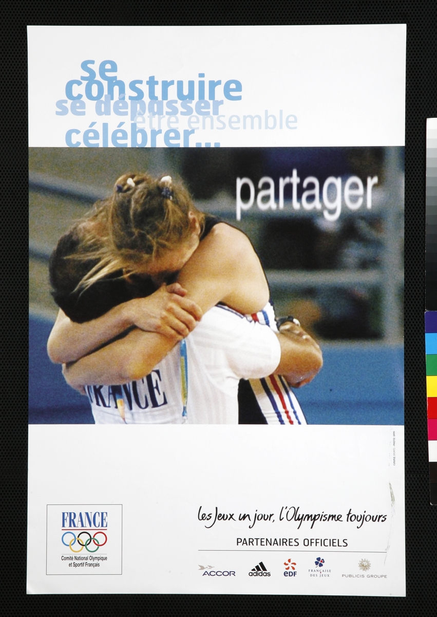 Two french athletes hugging each other. Caption: "Se construire se dépasser, être ensemble, célébrer, partager" and: "Les Jeux un jour, l'Olympisme toujours". Logo of the official sponsors.