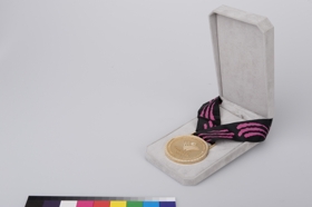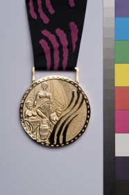 Obverse: Emblem of the Pan-American Games of Winnipeg. Caption: "Juegos Panamericanos – Pan American Games – Jeux Panaméricains" and "Winnipeg'99 - Canada". Reverse: Three women at work with an amphora and an abstract arabesque. With hook/ring to attach the ribbon, and black and plum ribbon with the same abstract arabesque.