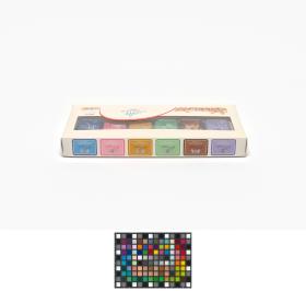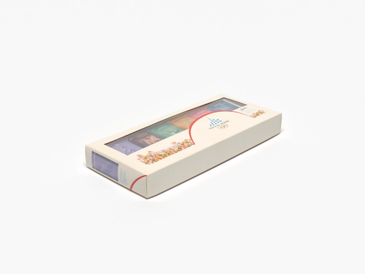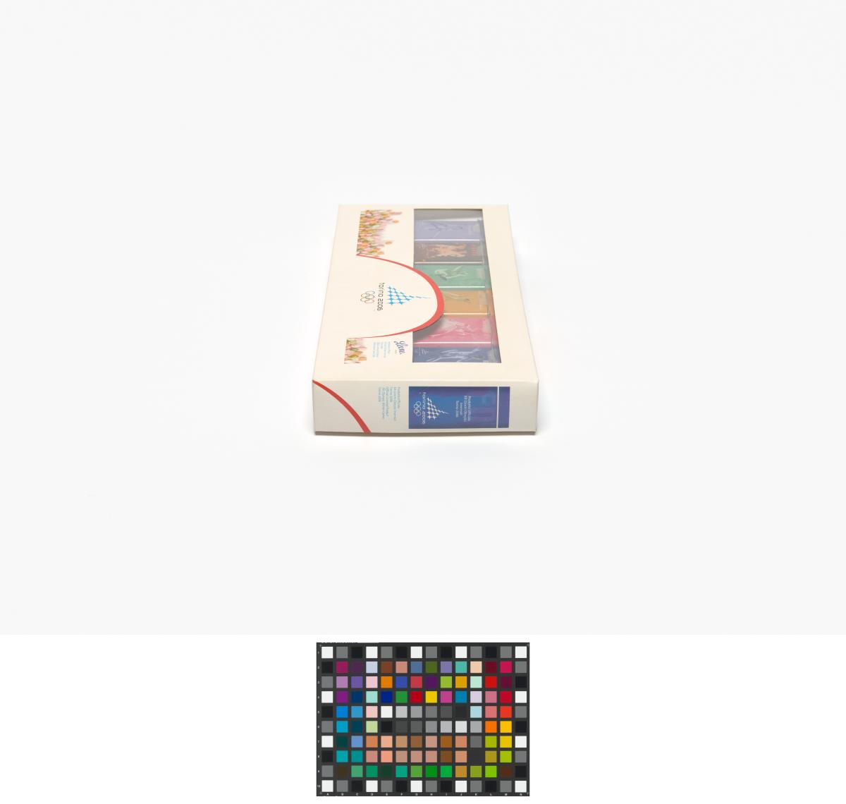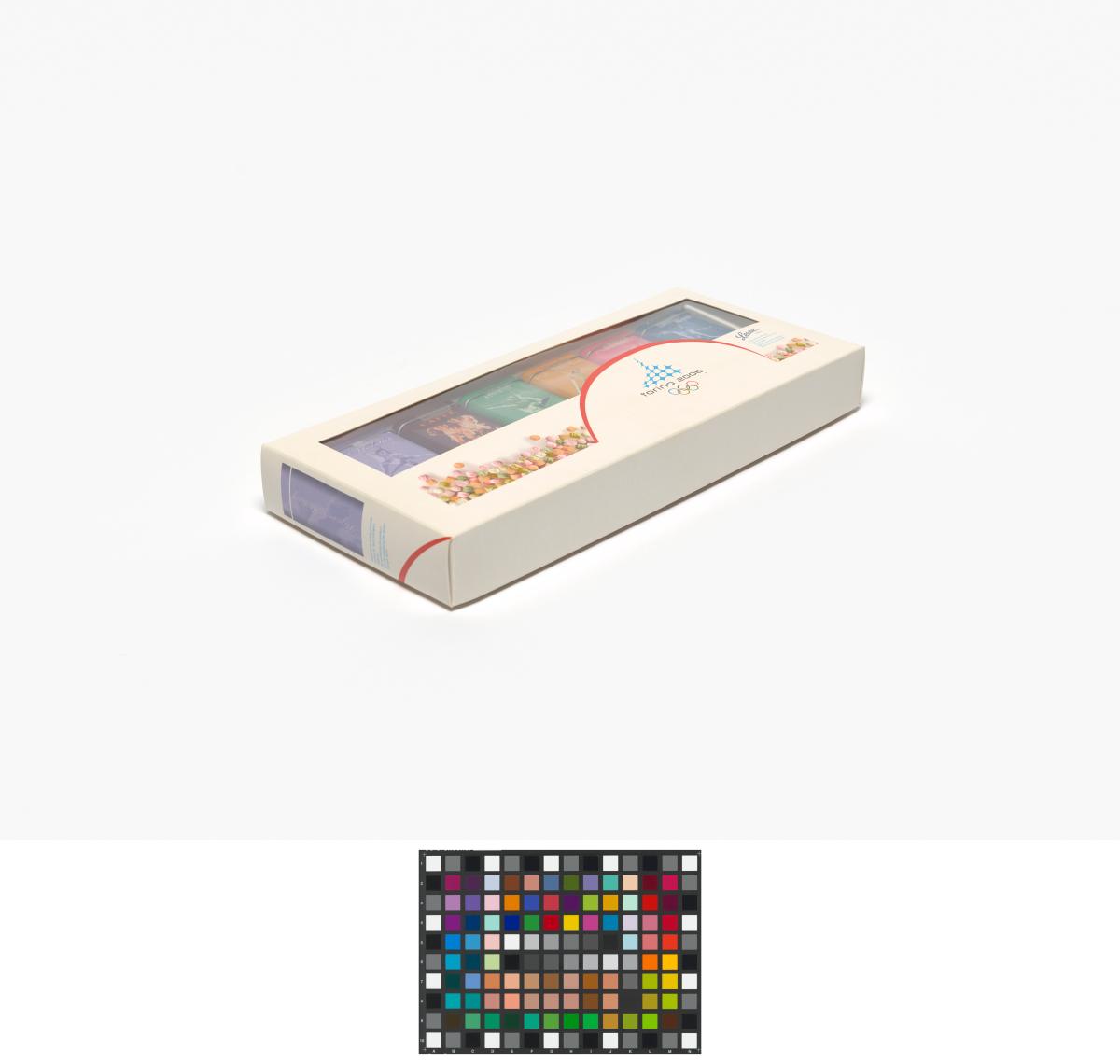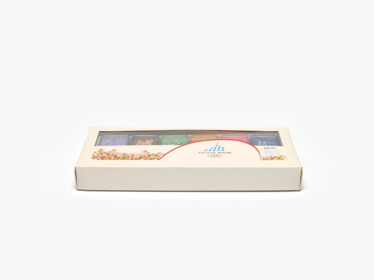 Packaging with six boxes with different sweets. Each one represent a witner sport. Caption: "Dal 1857 il Re della dolcezza {-} Since 1857 the King of sweetness". The package follows the graphic line of the Games, with an hologramme.