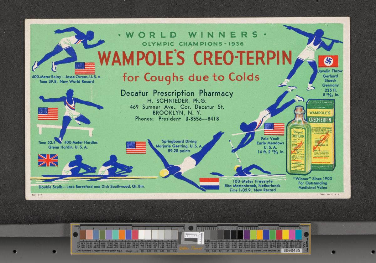Advertisement card with the representation of the Olympic champions of Berlin 1936 in the pictogram style. Caption: « WORLD WINNERS / OLYMPIC CHAMPIONS – 1936 / WAMPOLES’S CREO-TERPIN / for Coughs due to Colds / Decatur Prescription Pharmacy / H. Schnieder, Ph. G. / 469 Summer Ave., Cor, Decatur St. / Brooklyn, N. Y. / Phones: President 3-8556 - 8518» et « “Winner” since 1903 for outstanding medicinal value».