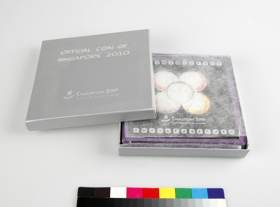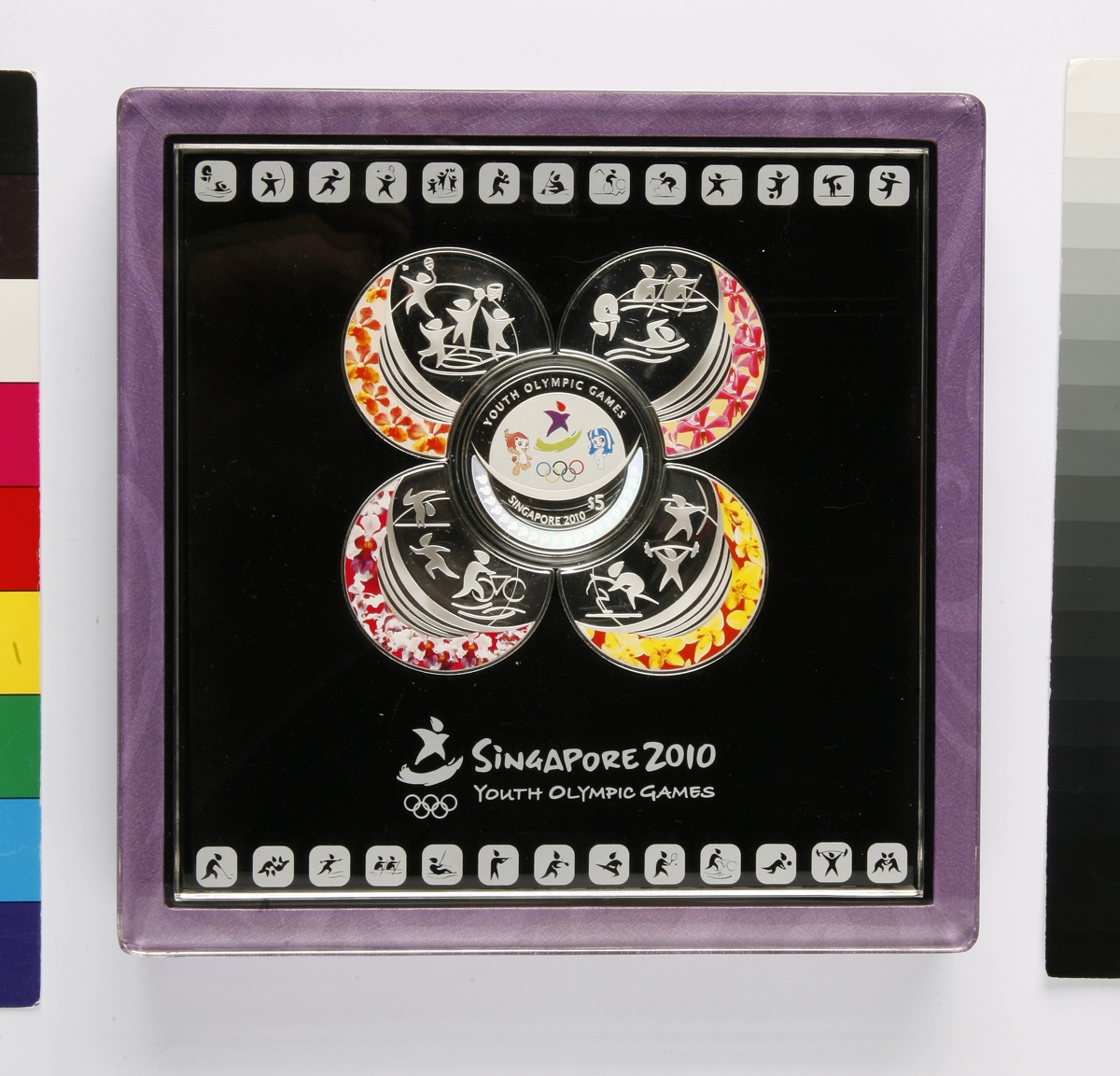 Coin: Games' emblem, Olympic symbol and Lyon and Merly, the Games' mascots. On the lower part, iconic Singapore lion head in dynamic hologram effect. Caption: "YOUTH OLYMPIC GAMES : SINGAPORE 2010 $ 5". Medallion: on each medallion, sport's pictograms and representation of several orchids on the rim.