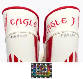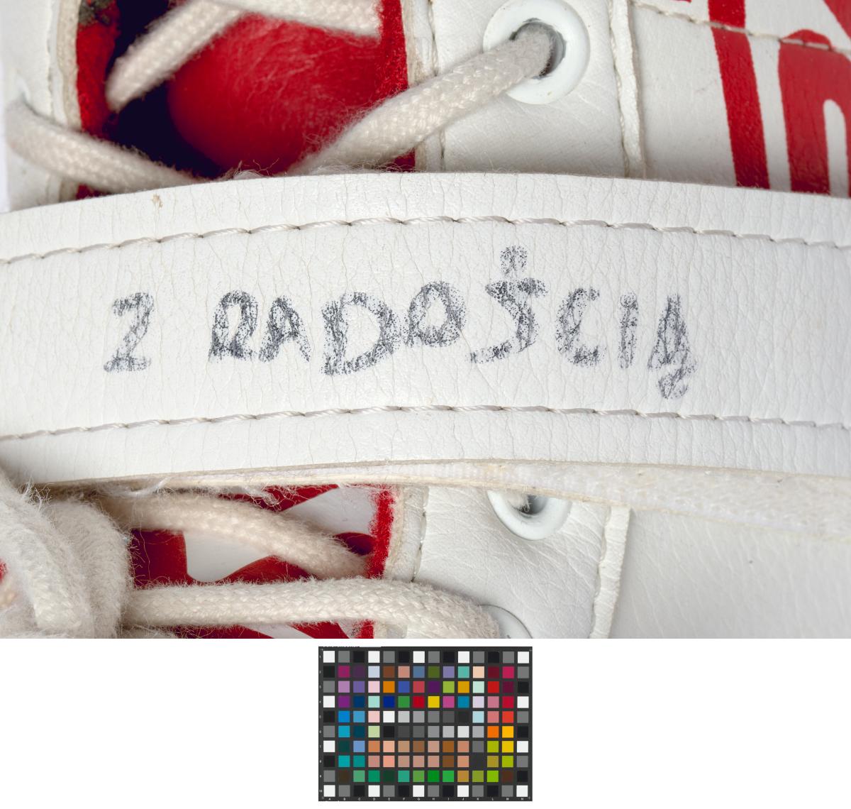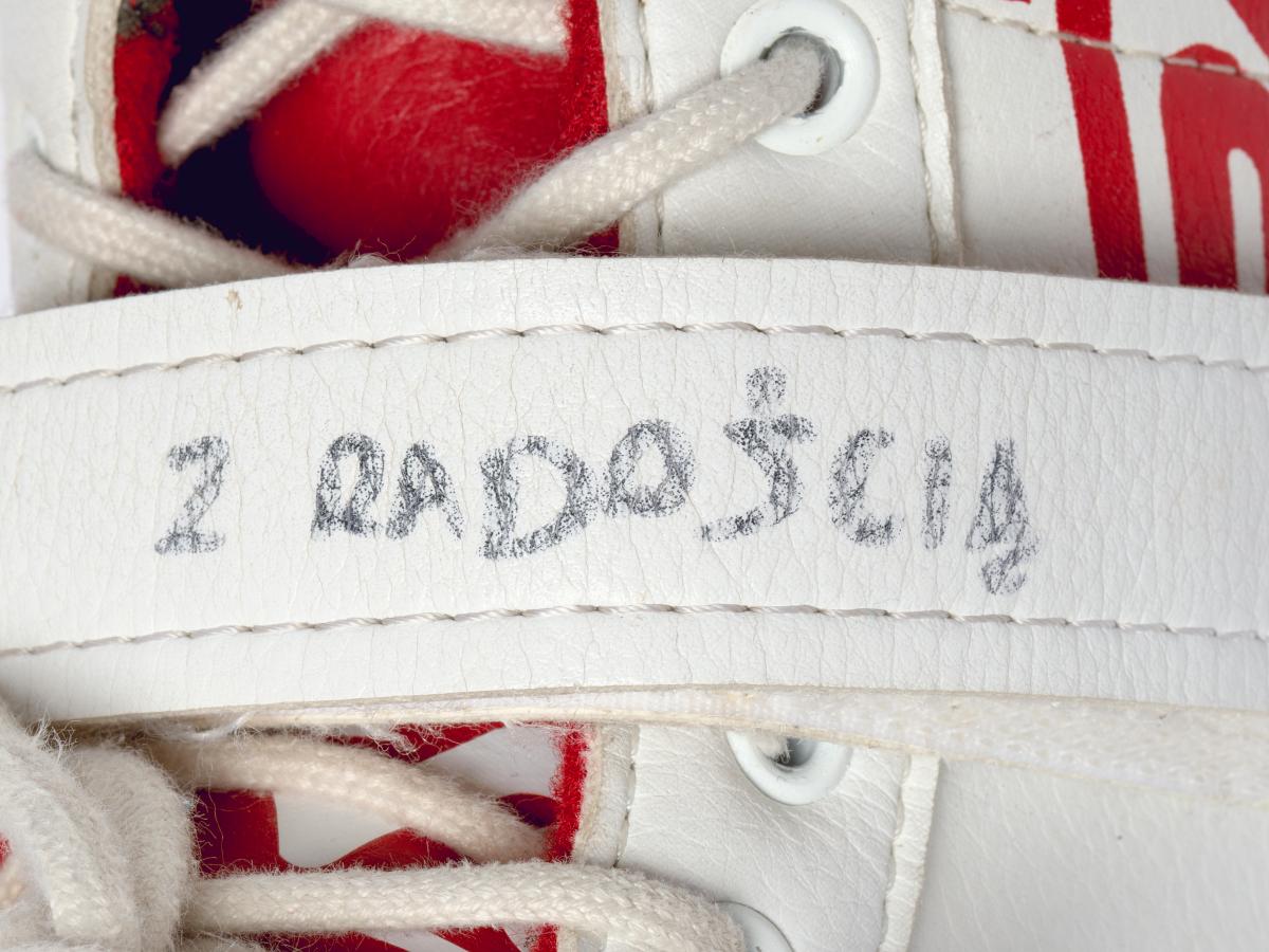 Pair of ankle-length boots, model "Eagle" with an eagle pattern, his nickname "Kamson" and an inscription "swobodnie z radoscia" (=librement avec joie). Size 40 (FR).