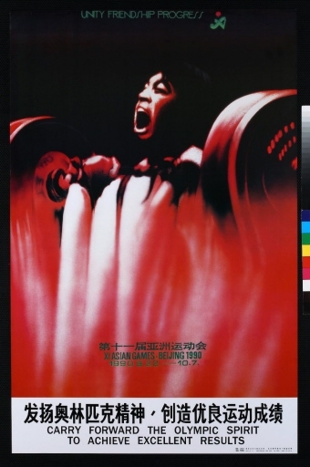 Sports poster with a weightlifter in full effort. Bilingual caption Chinese/English: "UNITY FRIENDSHIP PROGRESS / XI ASIAN GAMES.BEIJING / 1990 9.22-10.7 / CARRY FORWARD THE OLYMPIC SPIRIT / TO ACHIEVE EXCELLENT RESULTS". Games' emblem.