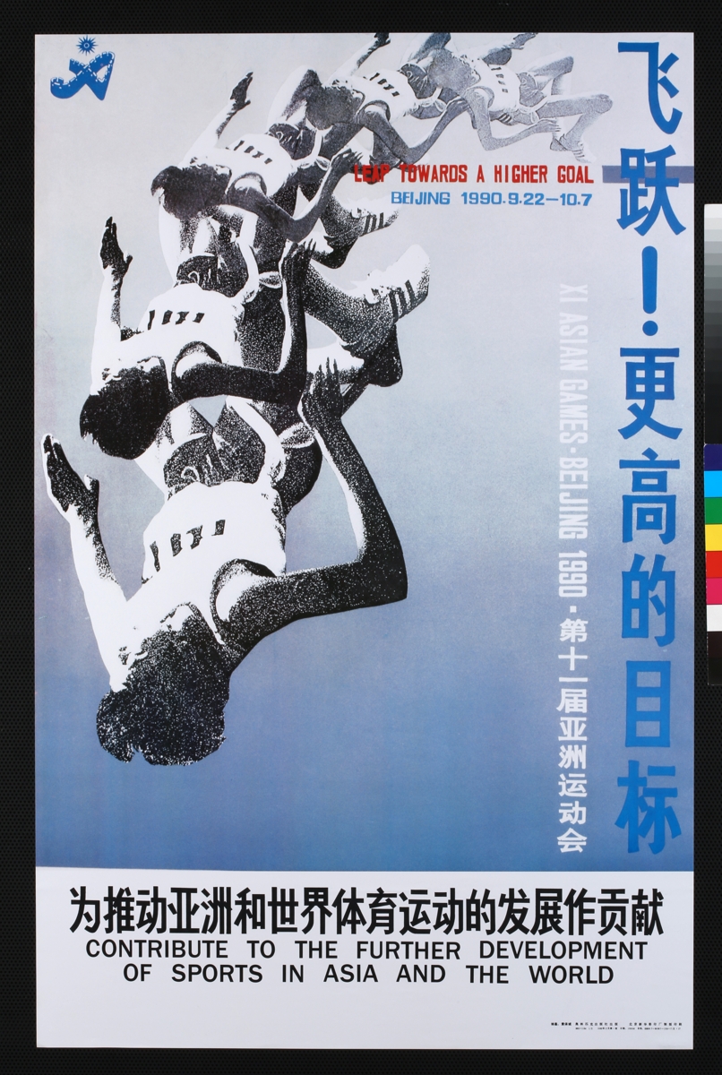 Sports poster with the decomposed drawing of a pole vault athlete in landing. Bilingual caption Chinese/English: "LEAP TOWARD A HIGHER GOAL / BEIJING 1990 9.22-10.7 / XI BEIJING 1990 / CONTRIBUTE TO THE FURTHER DEVELOPMENT / OF SPORTS UN ASIA AND THE WORLD". Games' emblem.