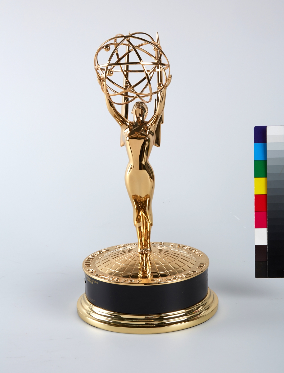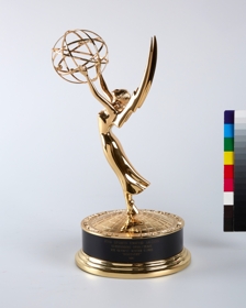 Winged woman raising an atom with her arms on a globe. Putting on a round base with the captions: "THE NATIONAL ACADEMY OF TELEVISION ARTS AND SCIENCE", "2010 SPORTS EMMY AWARDS ; OUTSTANDING OPEN/TEASE ; XXI OLYMPIC WINTER GAMES ; "DISCOVERY" ; NBC" and "INTERNATIONAL OLYMPIC COMMITTEE; COMMEMORATIVE".