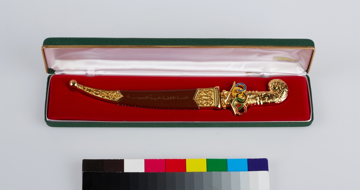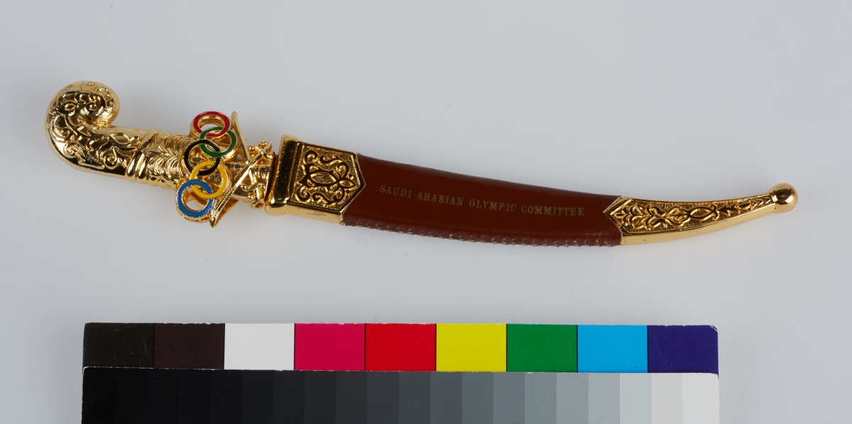 Dagger with on the handle the emblem of the Saudi Arabia's NOC with the colored Olympic rings. Scabbard with the English and Arabic caption: "SAUDI ARABIAN OLYMPIC COMMITTEE".