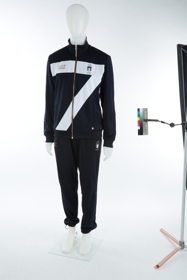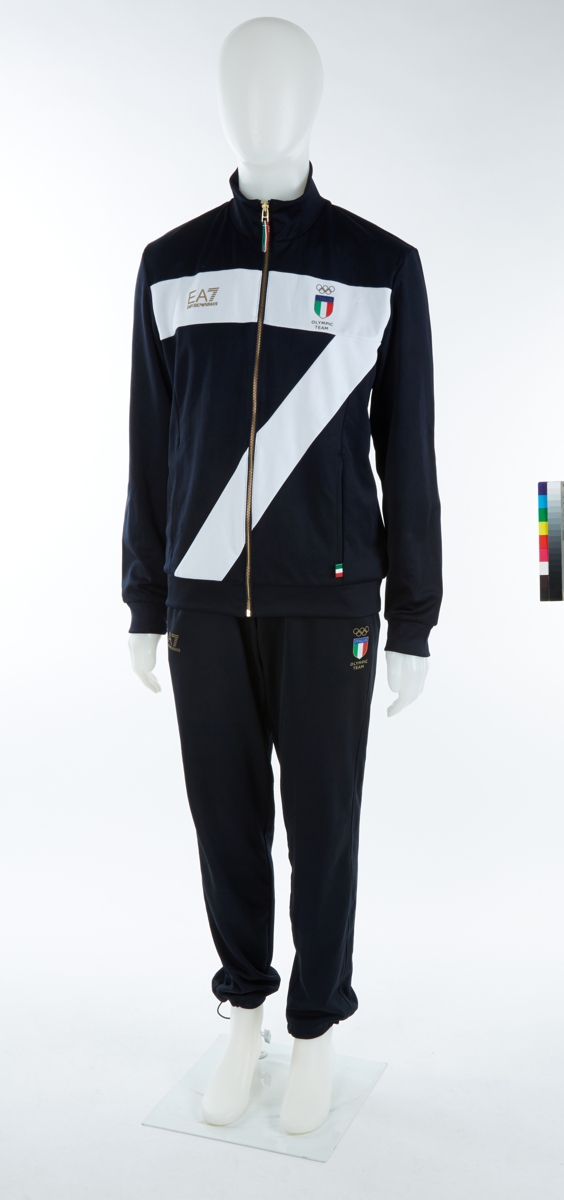 Training suit composed by a jacket and a pair of pants in Armani’s well-known, iconic, elegant midnight blue (unused). Clothes of the ea7 sportswear line, bearing the words “Fratelli d’Italia” (Brothers of Italy). Jacket with big graphic inserts in contrasting white and the word ‘ITALIA’ in gold on the back Extract from the Italian national hymn (Mameli's hymn) printed inside. Size XL.