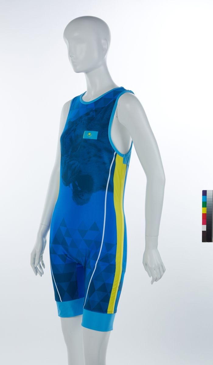 Suit in national colors (blue and yellow). On the front we find the image of a feline (snow leopard?) head and the national flag at the rear there is the central element of the national flag with the manufacturer's logo. Caption: "MANYUROVA / KAZ". Athlete's signature with a dedication: "75 kg RIO / 2016". Size: XL.