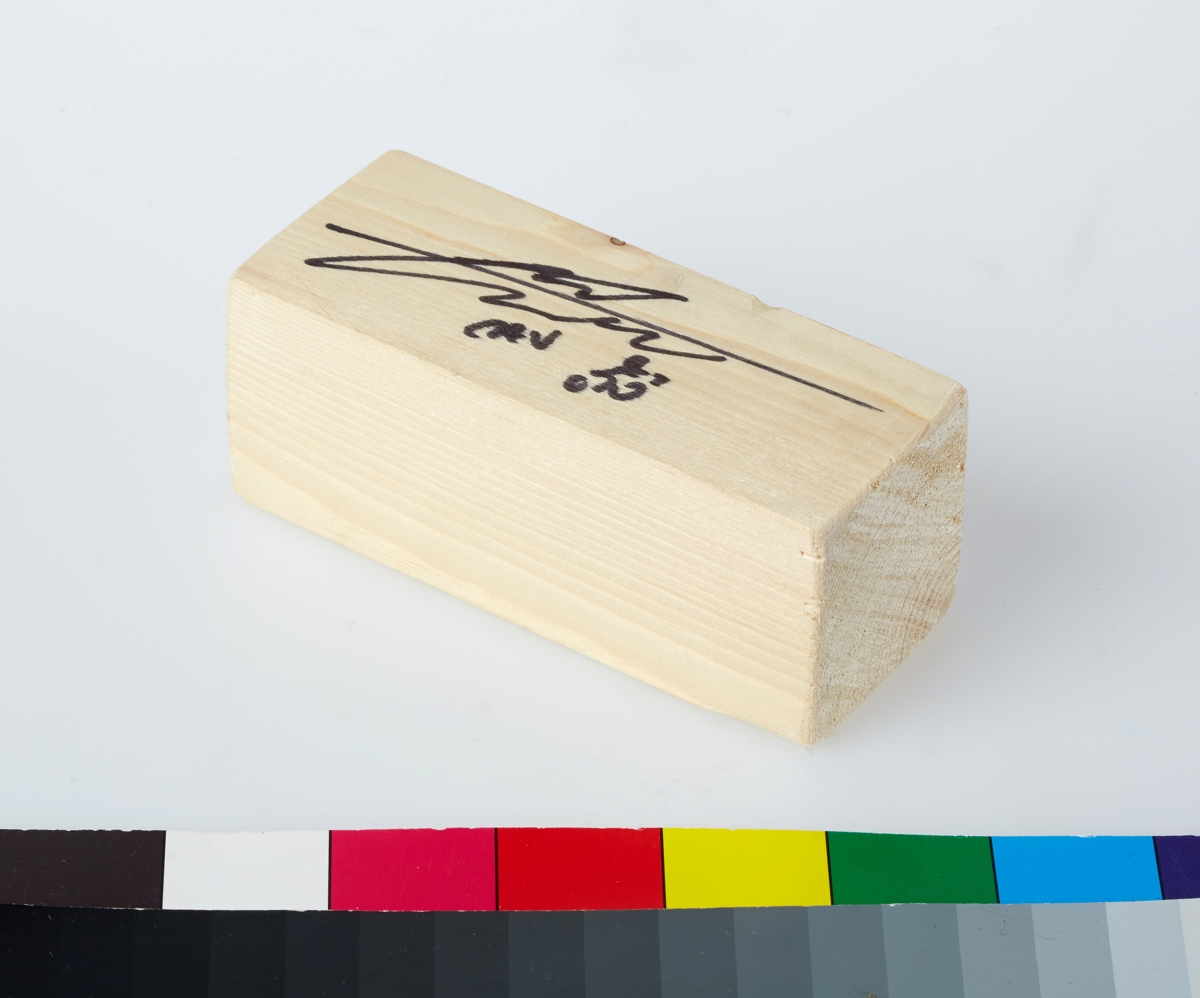Wooden block, made of Siberian pine (country of provenance to be confirmed), signed by Mark Cavendish.