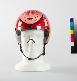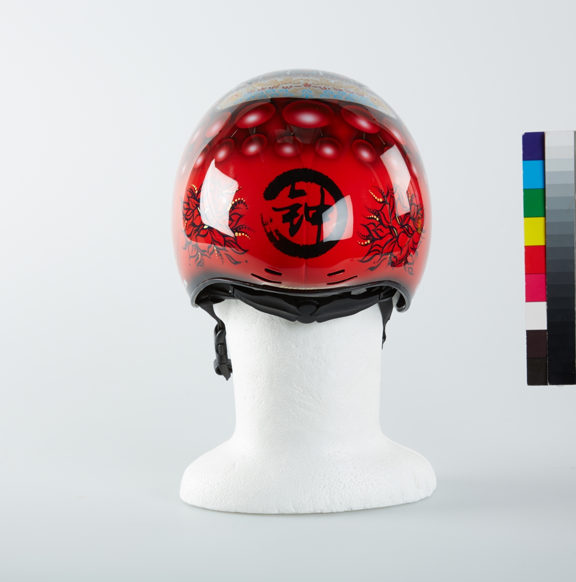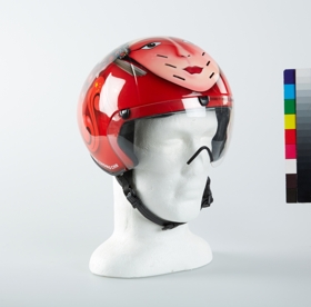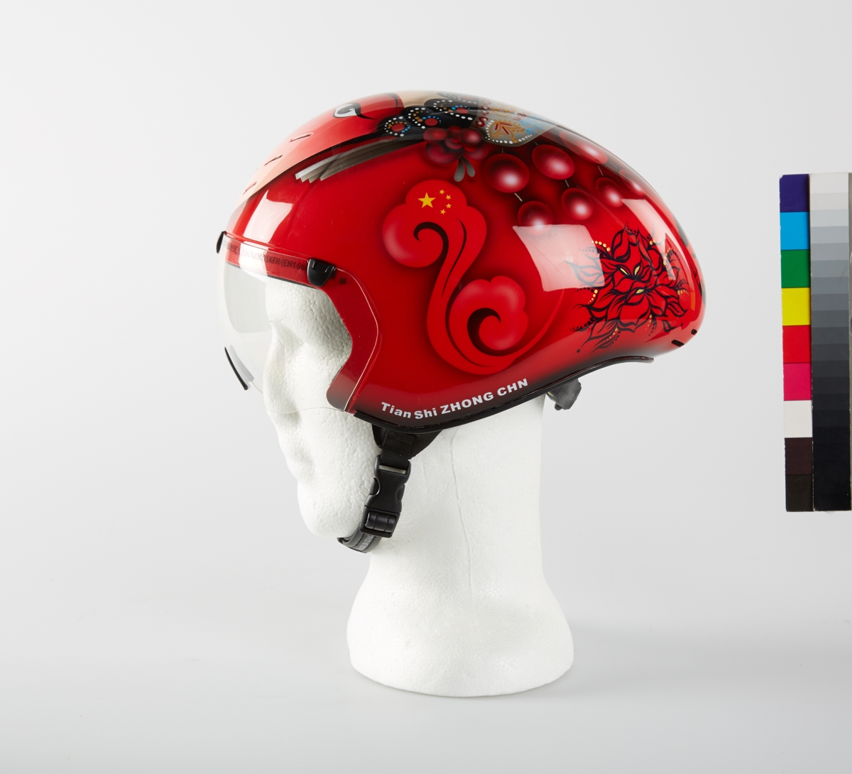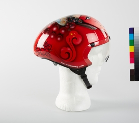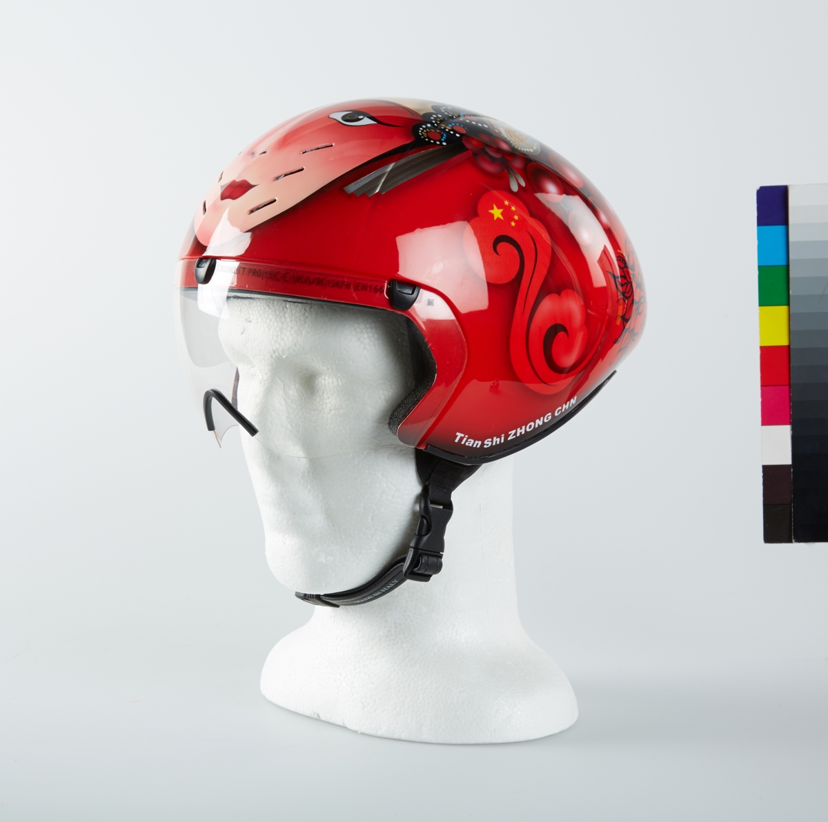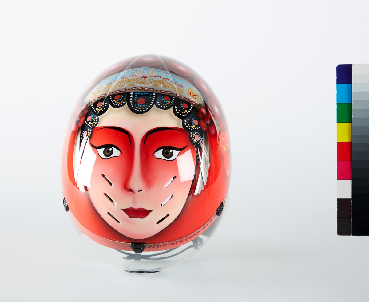 CRONO TT PRO red helmet with a transparent visor. On the top, the design of the face of Hua Mulan surrounded by clouds with the China's flag. On the back of the helmet the Chinese letter for "ZHONG" surrounded by two lotus flowers. On both side: "Tian Shi ZHONG CHN". Inside date: November 2015