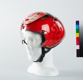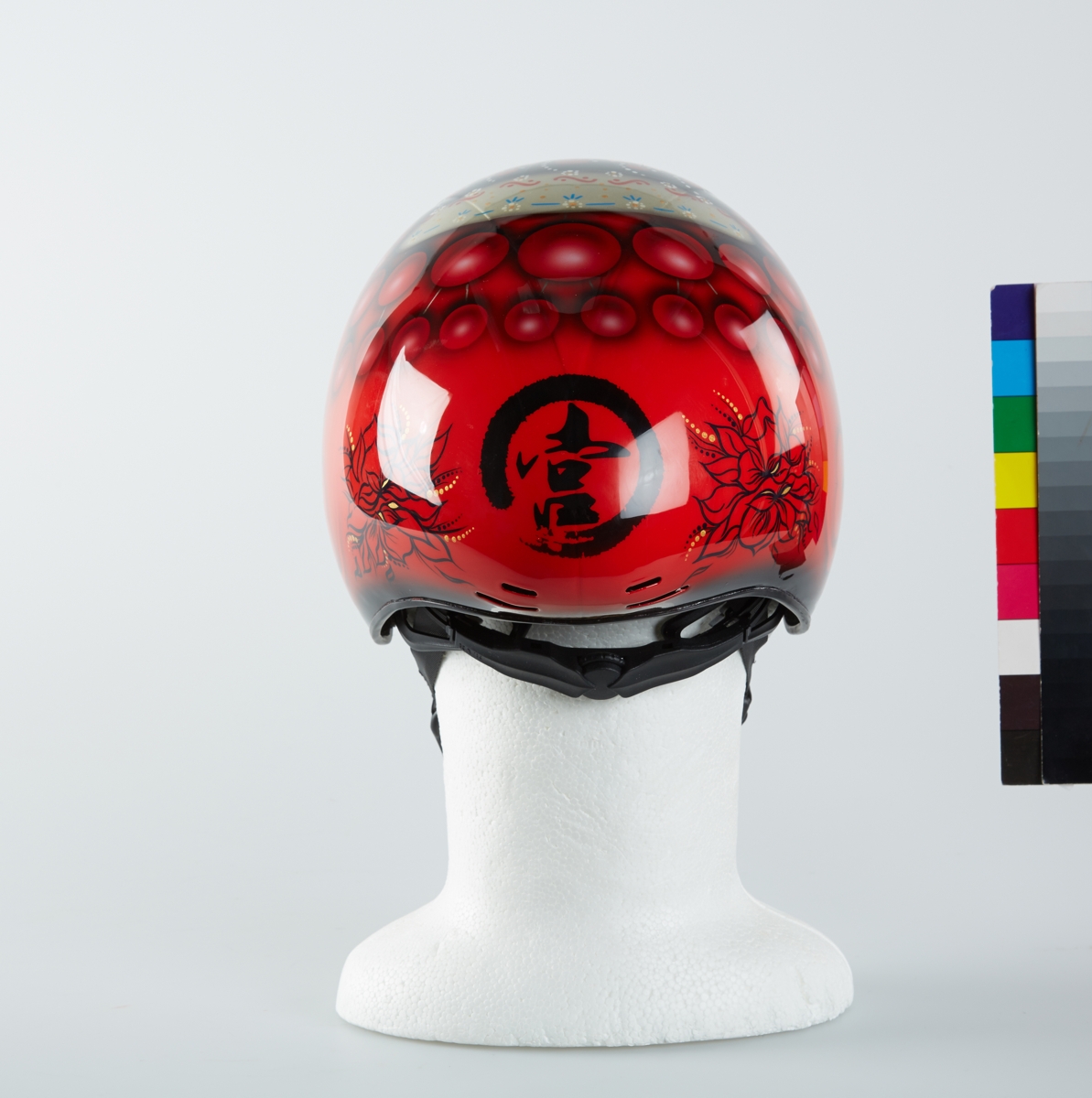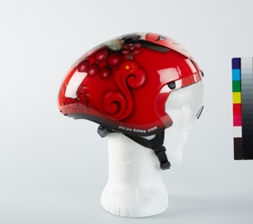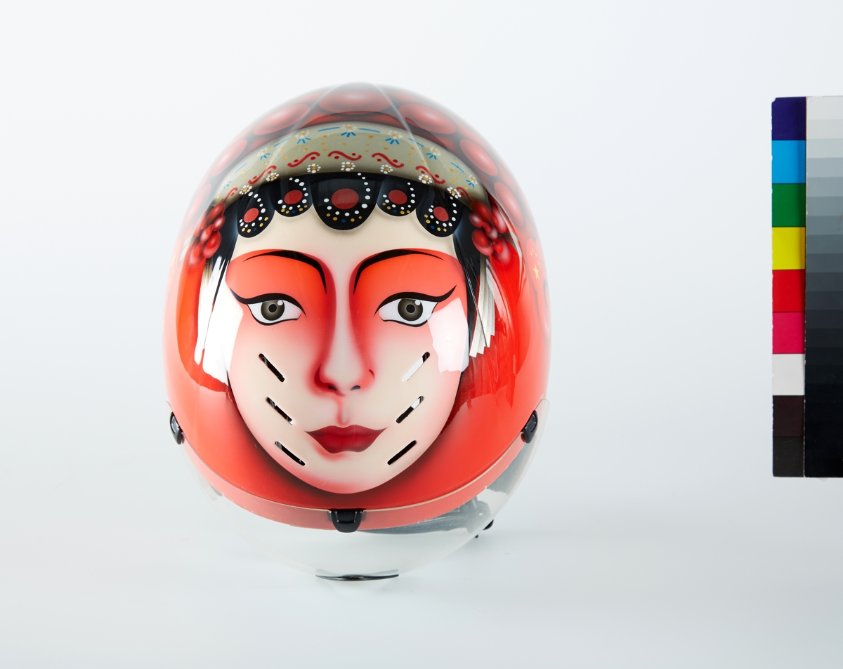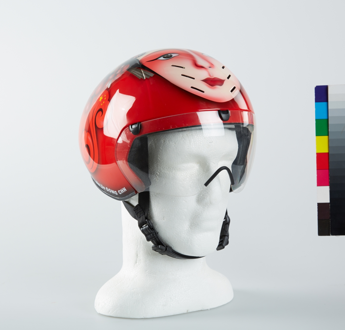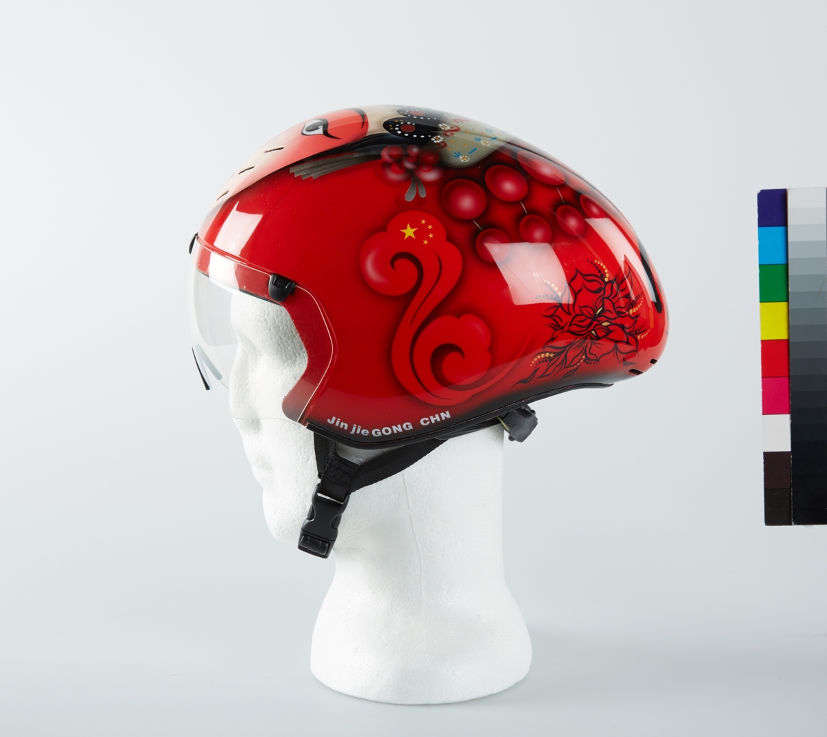 CRONO TT PRO red helmet with a transparent visor. On the top, the design of the face of Mu Guiying surrounded by clouds with the China's flag. On the back of the helmet the Chinese letter for "GONG" surrounded by two lotus flowers. On both side: "Jin Jie GONG CHN". Inside date: November 2015