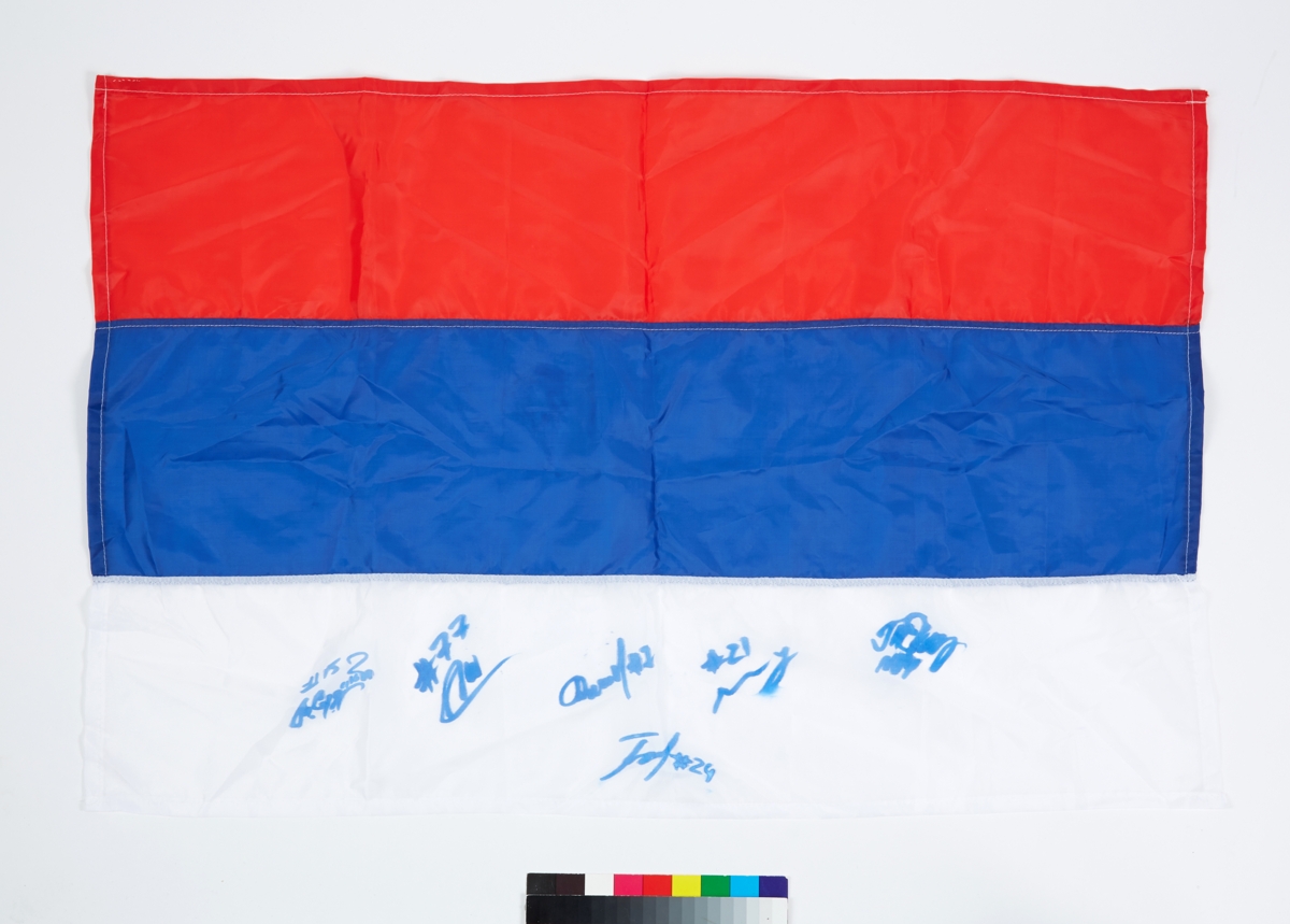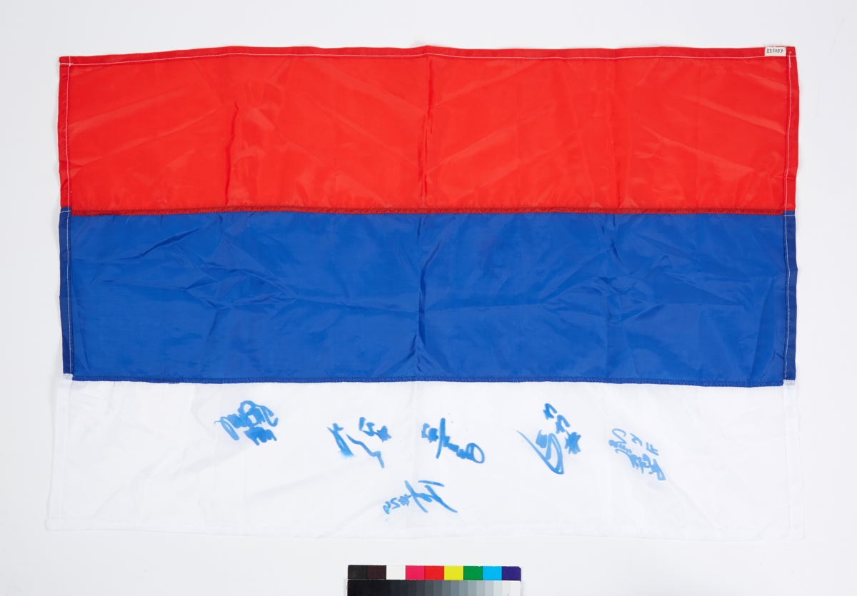 Flag of the Russian Federation with the signatures of the 6 athletes of the Russian Federation women's handball team, including: Maya Petrova (Nr. 77), Victoria Zhilinskayte (Nr. 21) and Irina Bliznova (Nr. 24).