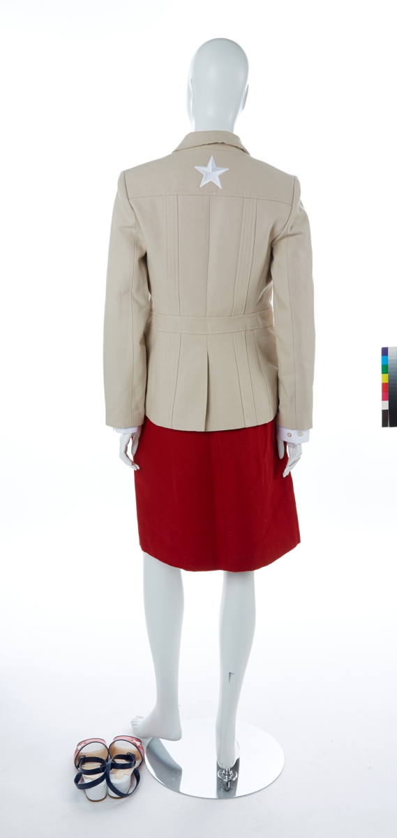 Outfit composed of a jacket, a shirt, a short-length skirt and kitten heel sandal.