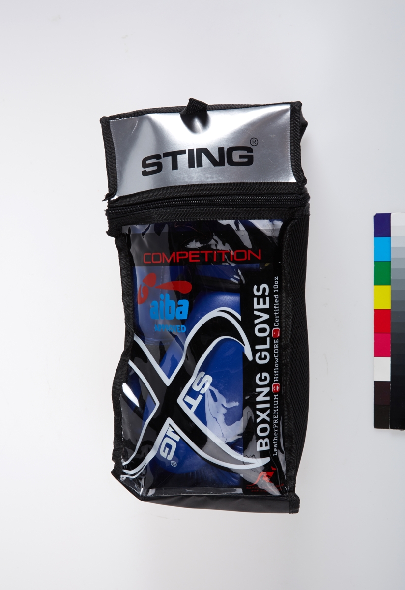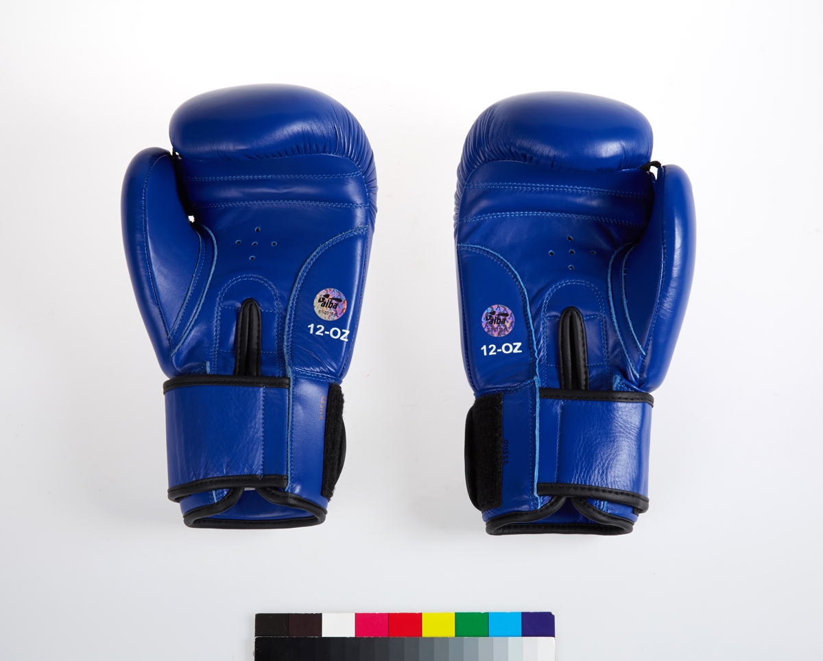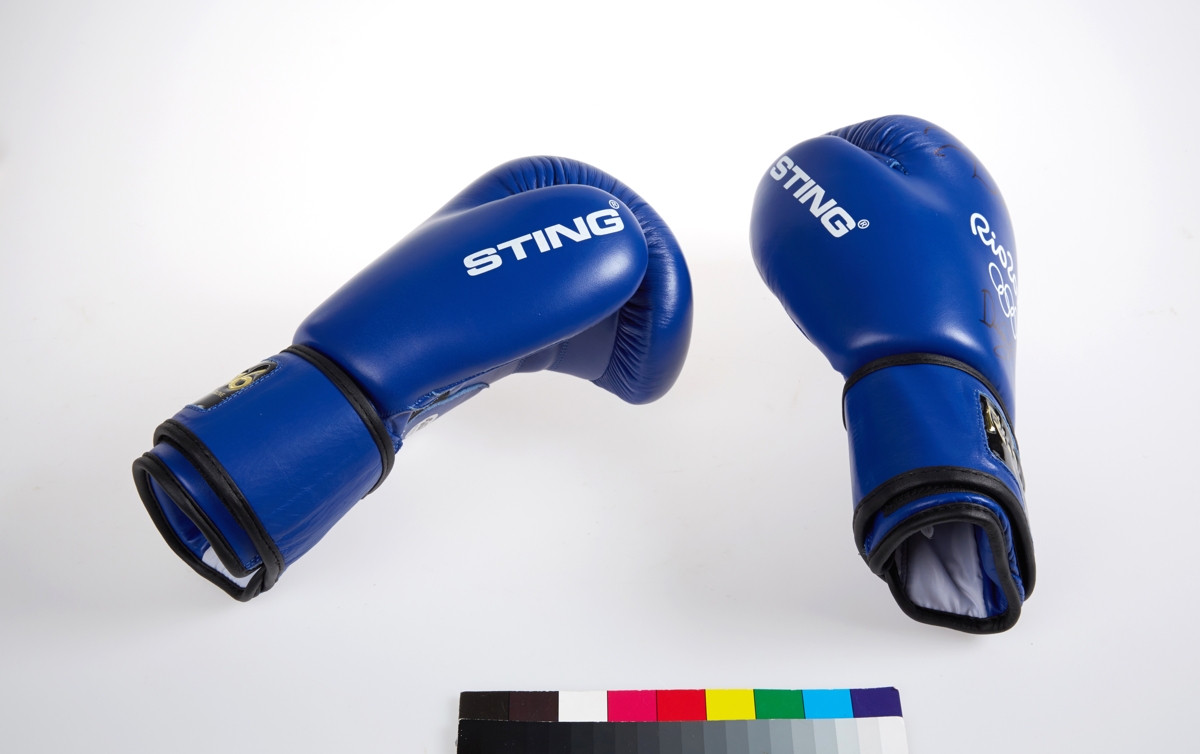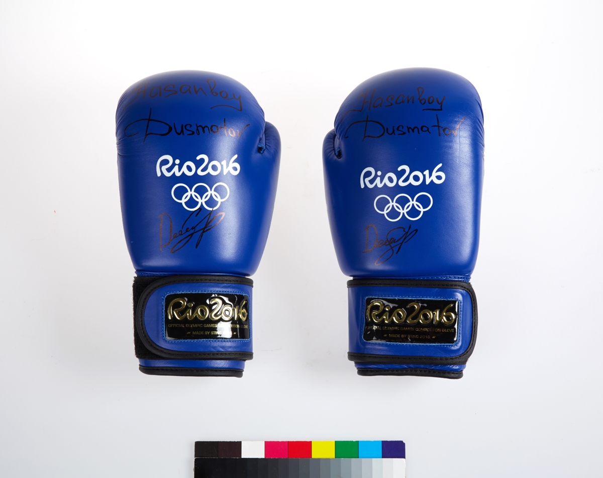 Rio 2016 official pair of boxing gloves. Signed by the athlete Hansanboy DUSMATOV, "Rio 2016" and Olympic symbol. Text on the wrist: "Rio2016/OFFICIAL OLYMPIC COMPETITION GLOVE / MADE BY STING 2016". Aiba Hologram. Size 12.