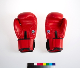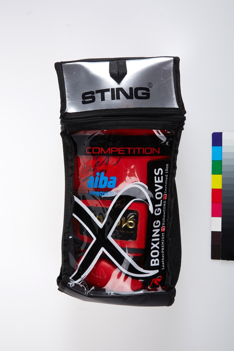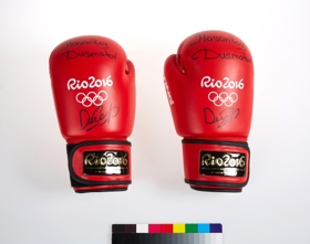 Rio 2016 official pair of boxing gloves. Signed by the athlete Hansanboy DUSMATOV, "Rio 2016" and Olympic symbol. Text on the wrist: "Rio2016/OFFICIAL OLYMPIC COMPETITION GLOVE / MADE BY STING 2016". Aiba Hologram. Size 12.