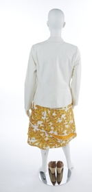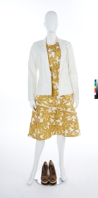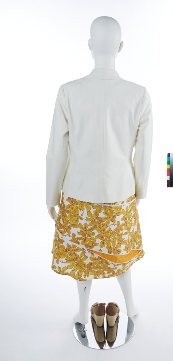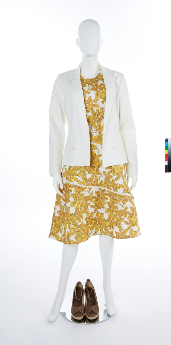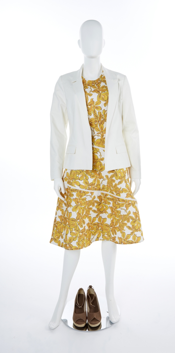 Ensemble composed of a dress with decorative zip, a blazer and wedge sandals.