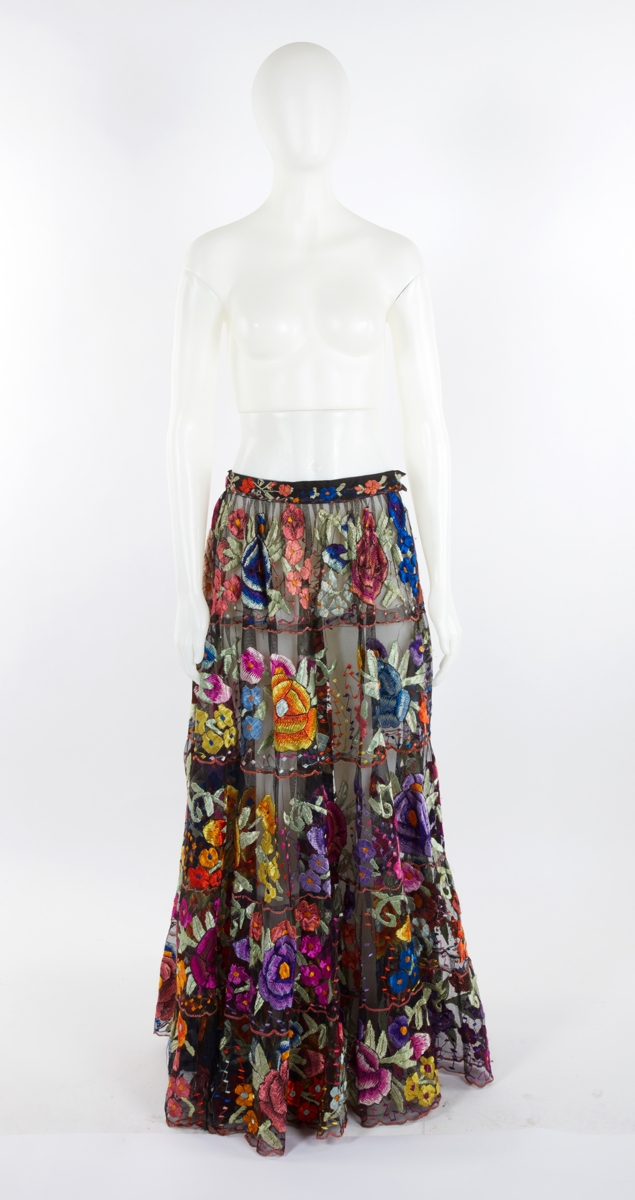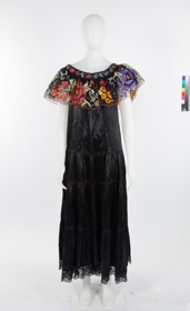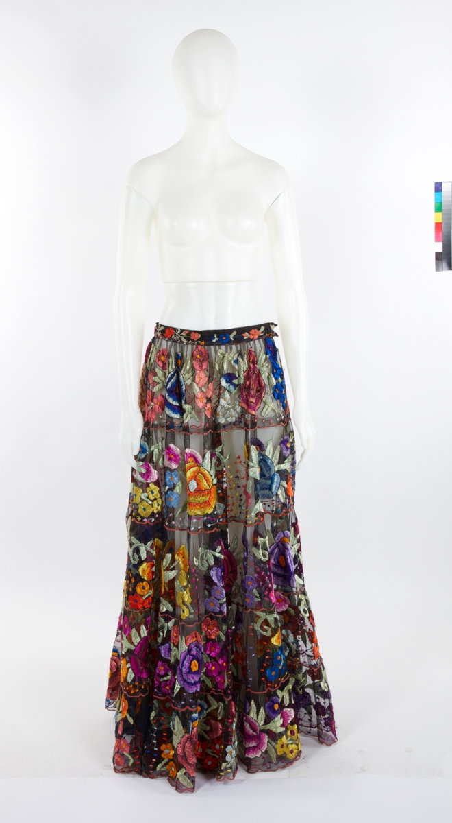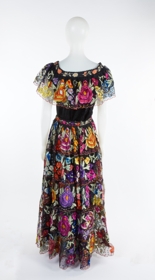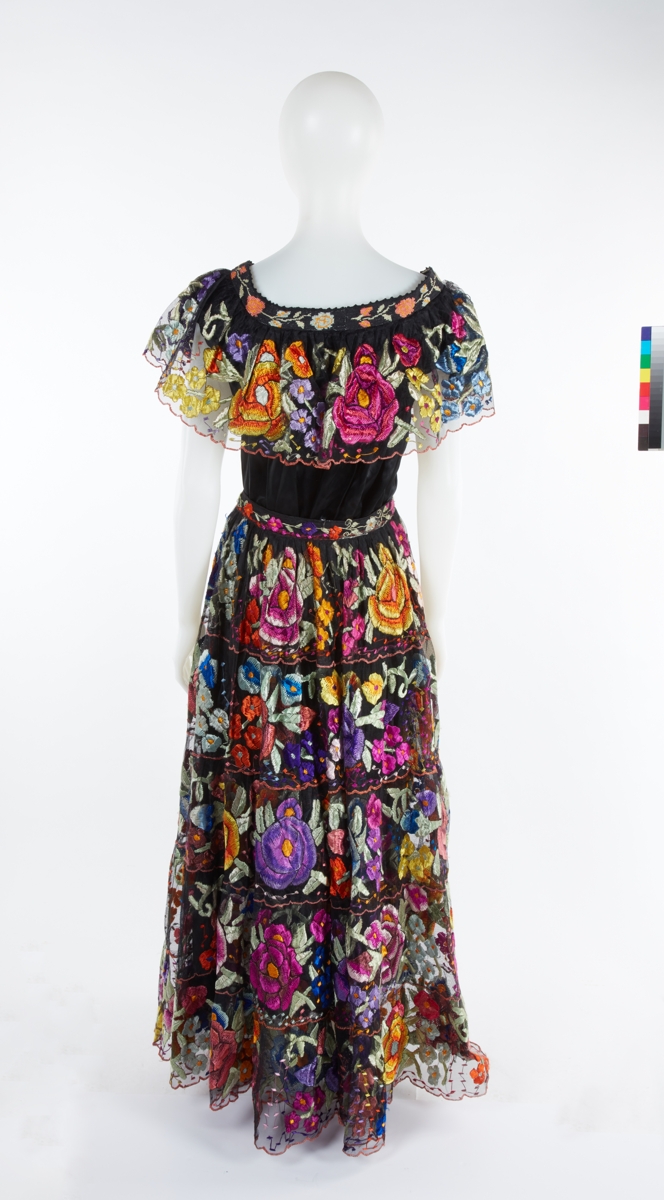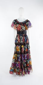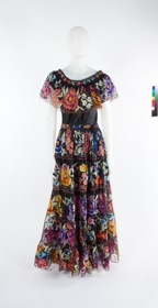 Folkloric dress and overskirt with multi ruffles and flower patterns.