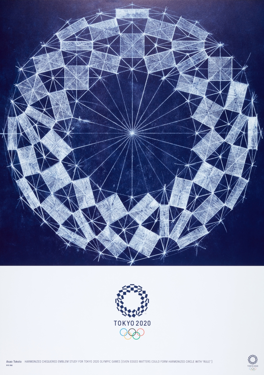 Reference record. Tokyo 2020, artistic poster for Olympic Games «Harmonized Chequered Emblem Study for Tokyo 2020 Olympic Games [Even Edged Matters Could Form Harmonized Circle with "Rule"]» by TOKOLO Asao.