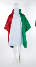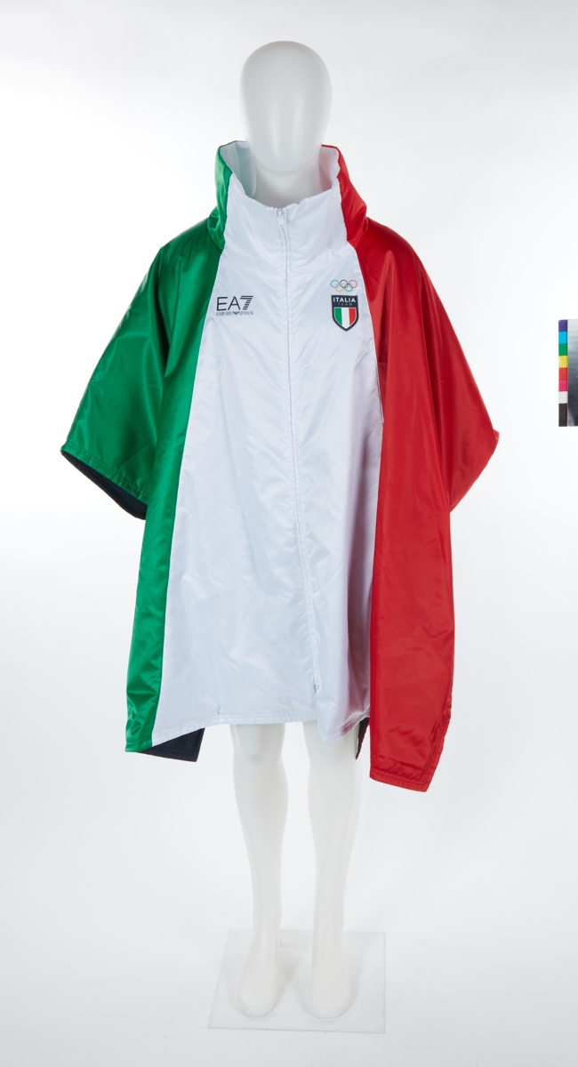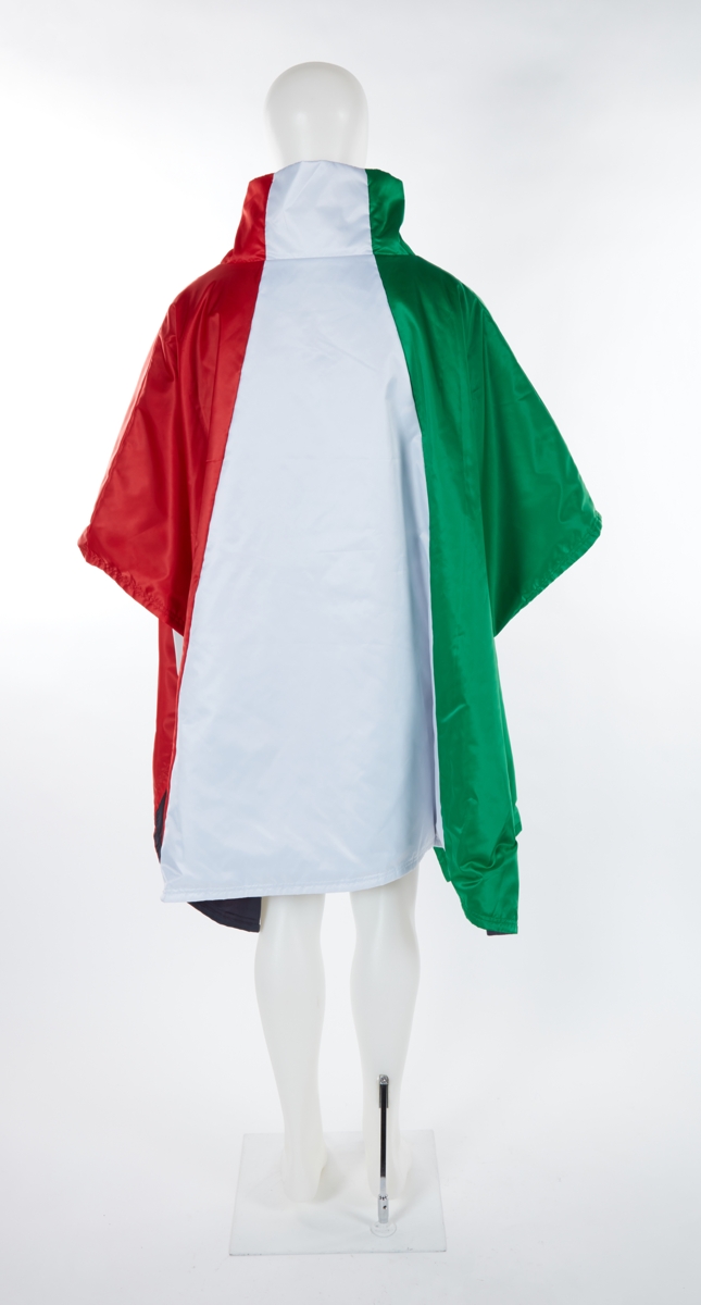 Large dufted cape in the colours of the Italian national flag, collection EA7, to be worn over anorak and pants.