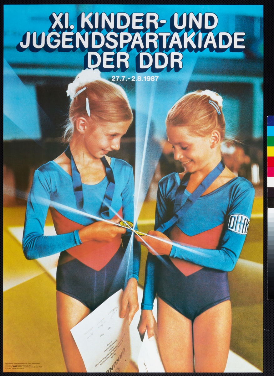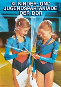 Photographic poster showing two young girls in gymnastics uniforms with their medals. Caption "XI. Kinder- und Jugendspartakiade der DDR. 27.7 - 2.8.1987". Publisher: Organisationsbüro VIII. Turn- und Sportfest and XI. Kinder- und Jugendspartakiade der DDR.