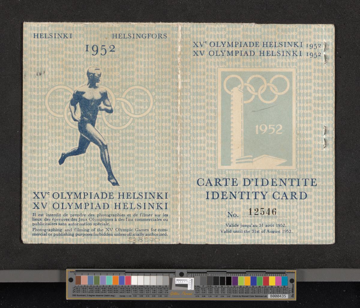 Identity card Nr. 12546. With the photograph of Mr. Amann. Emblem of the Games on the cover and Paavo Nurmi running in front of the Olympic rings on the back.
