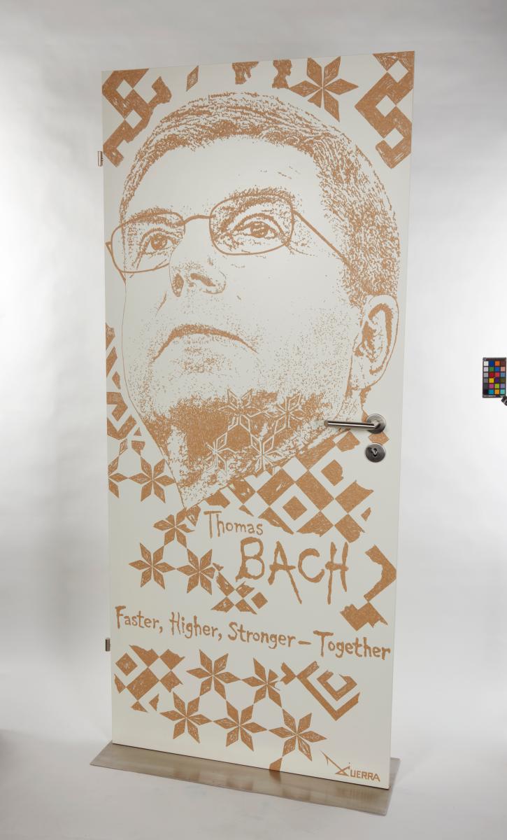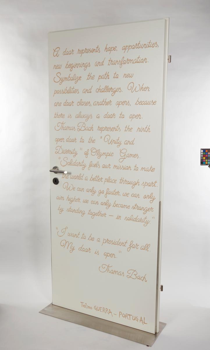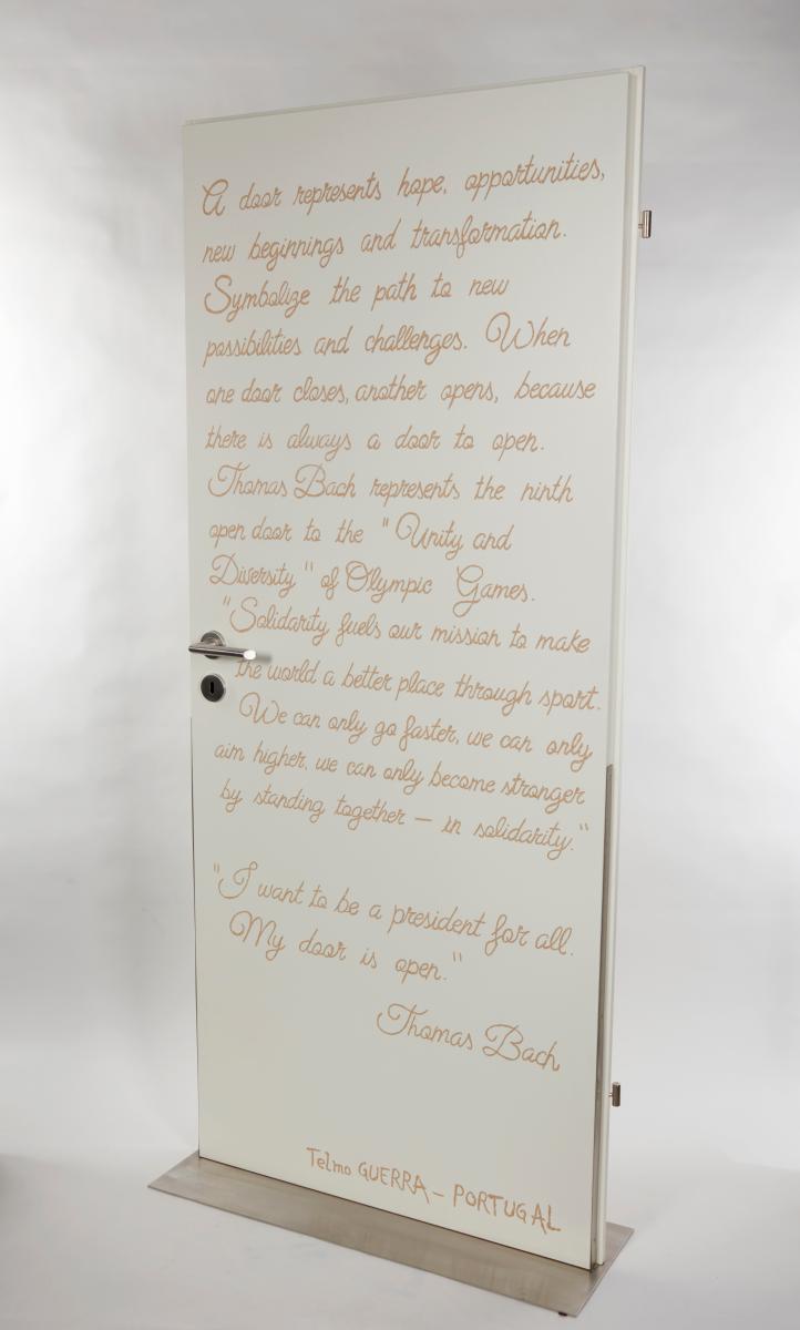 For Telmo Guerra, Pierre de Coubertin opened the door to the modern Olympic Games, while Thomas Bach symbolises the door open to the unity and diversity of the Games. Guerra explains: I often use doors to create my works, because a Door represents hope, opportunities, new beginnings and transformation. It represents the opening of new possibilities and challenges in the future. When one door closes, another one opens, because there is always one door to open.