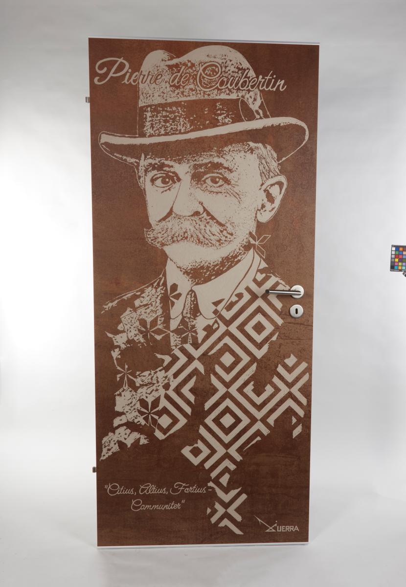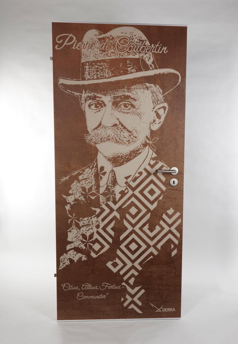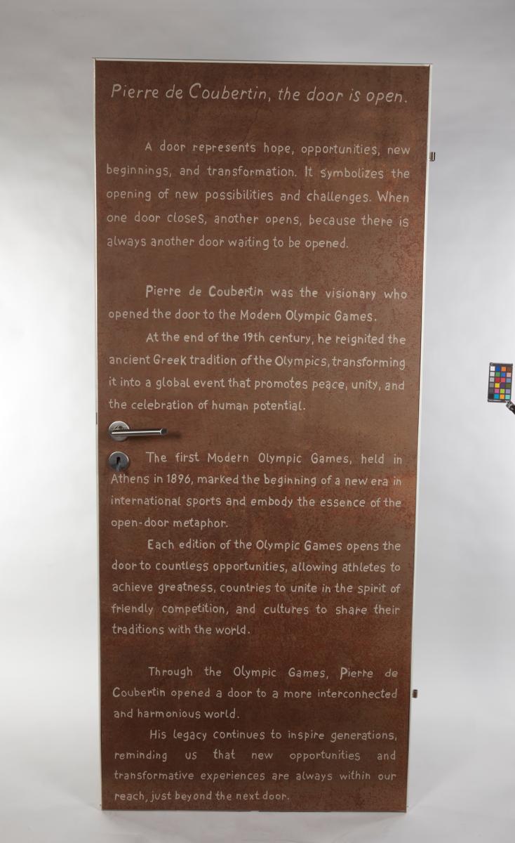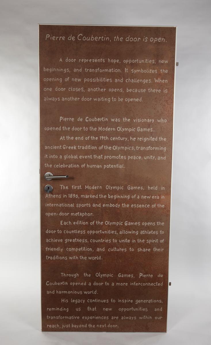 White door with an engraved portrait of Thomas Bach. Caption "Faster, Higher, Stronger - Together". Engraved text on the back.
