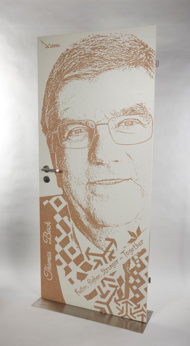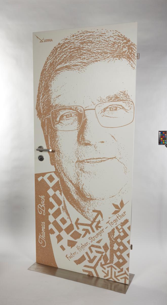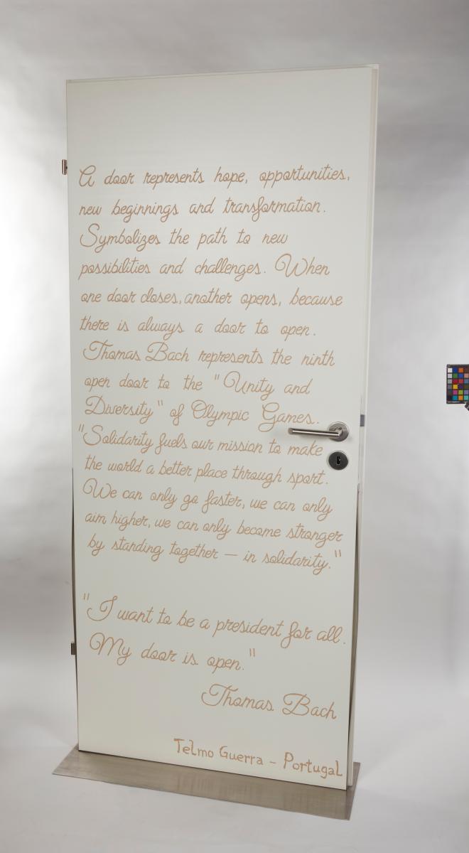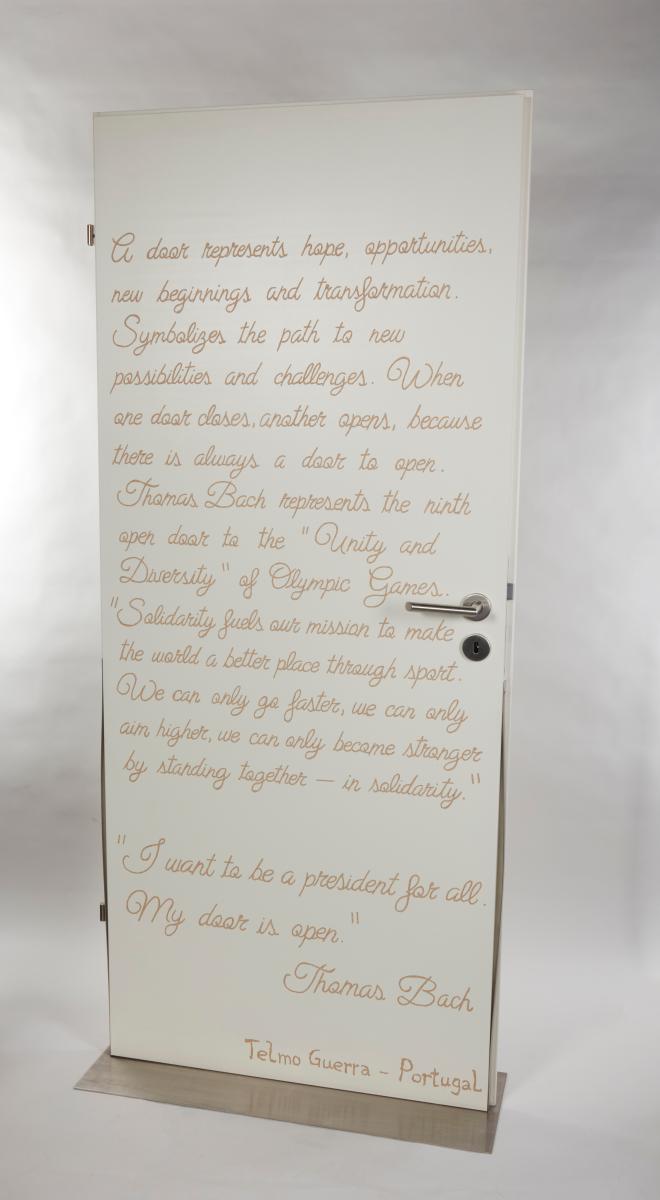 For Telmo Guerra, Pierre de Coubertin opened the door to the modern Olympic Games, while Thomas Bach symbolises the door open to the unity and diversity of the Games. Guerra explains: I often use doors to create my works, because a Door represents hope, opportunities, new beginnings and transformation. It represents the opening of new possibilities and challenges in the future. When one door closes, another one opens, because there is always one door to open.