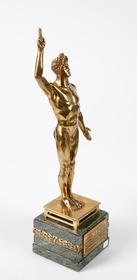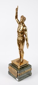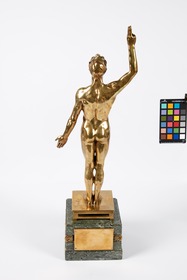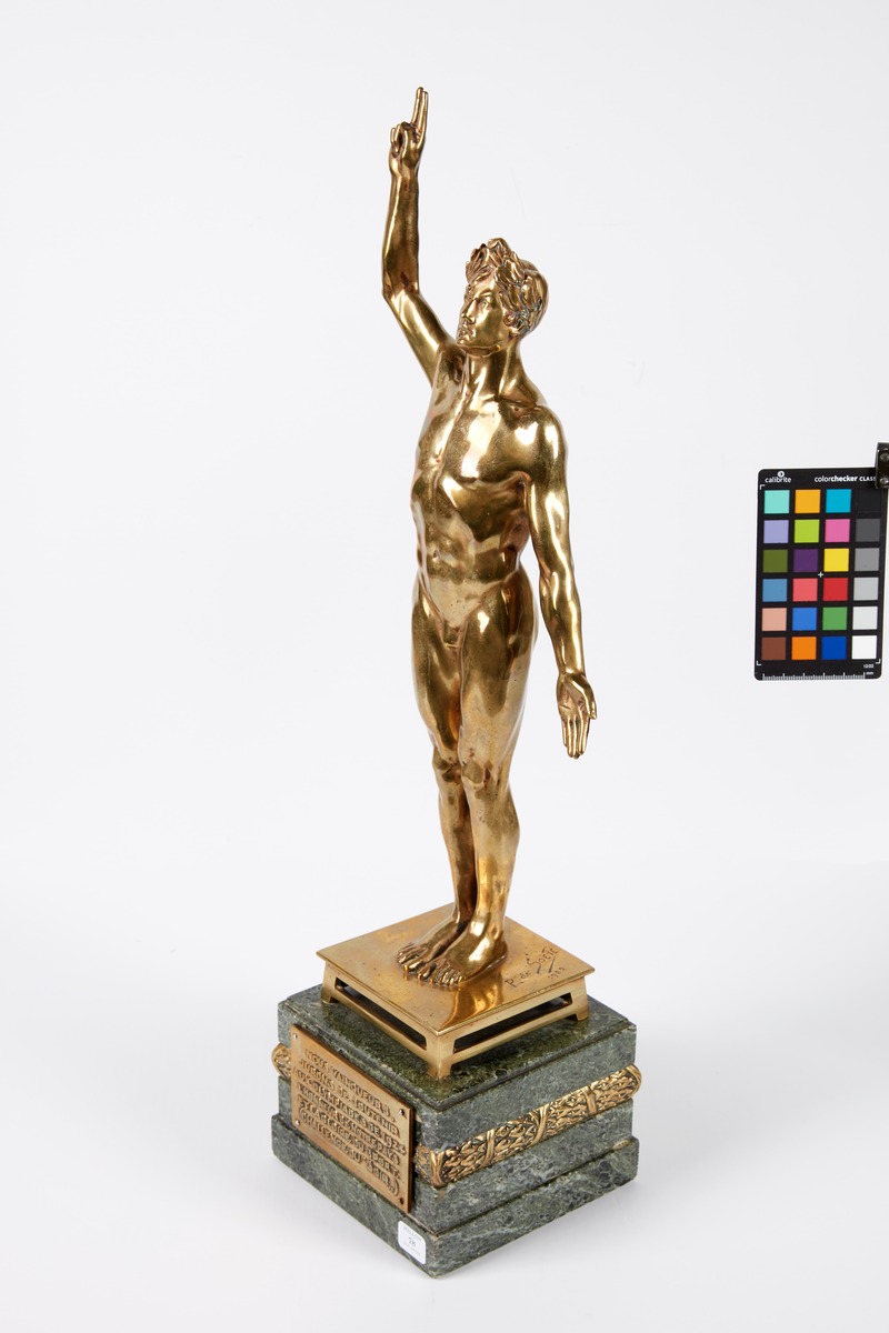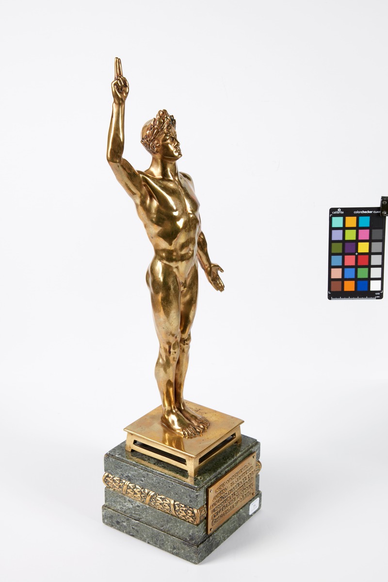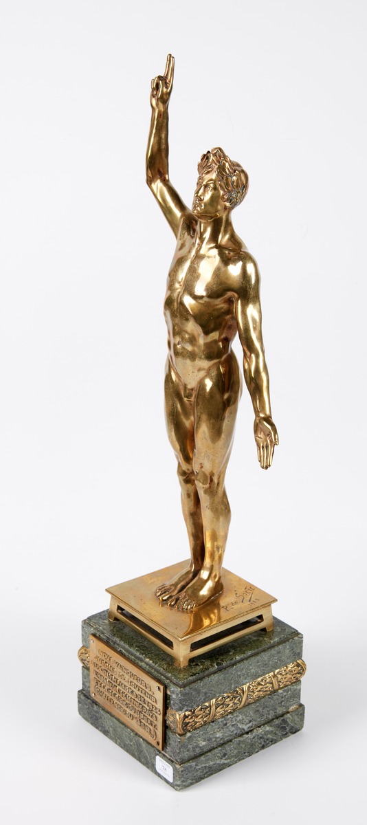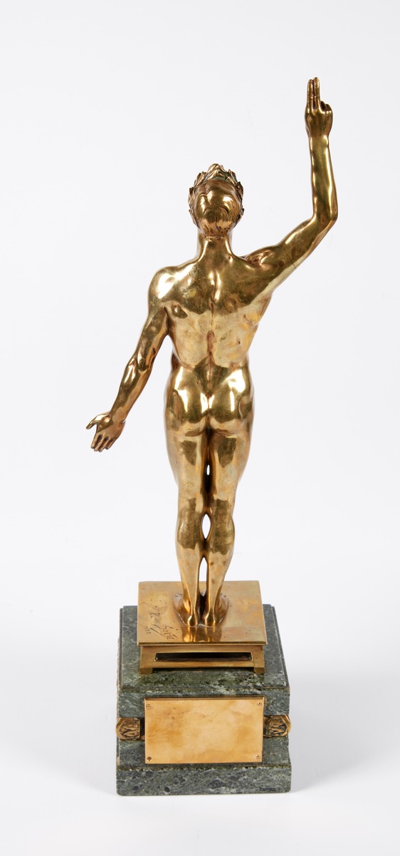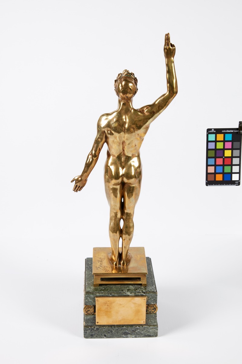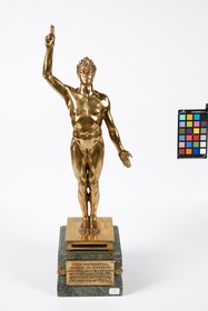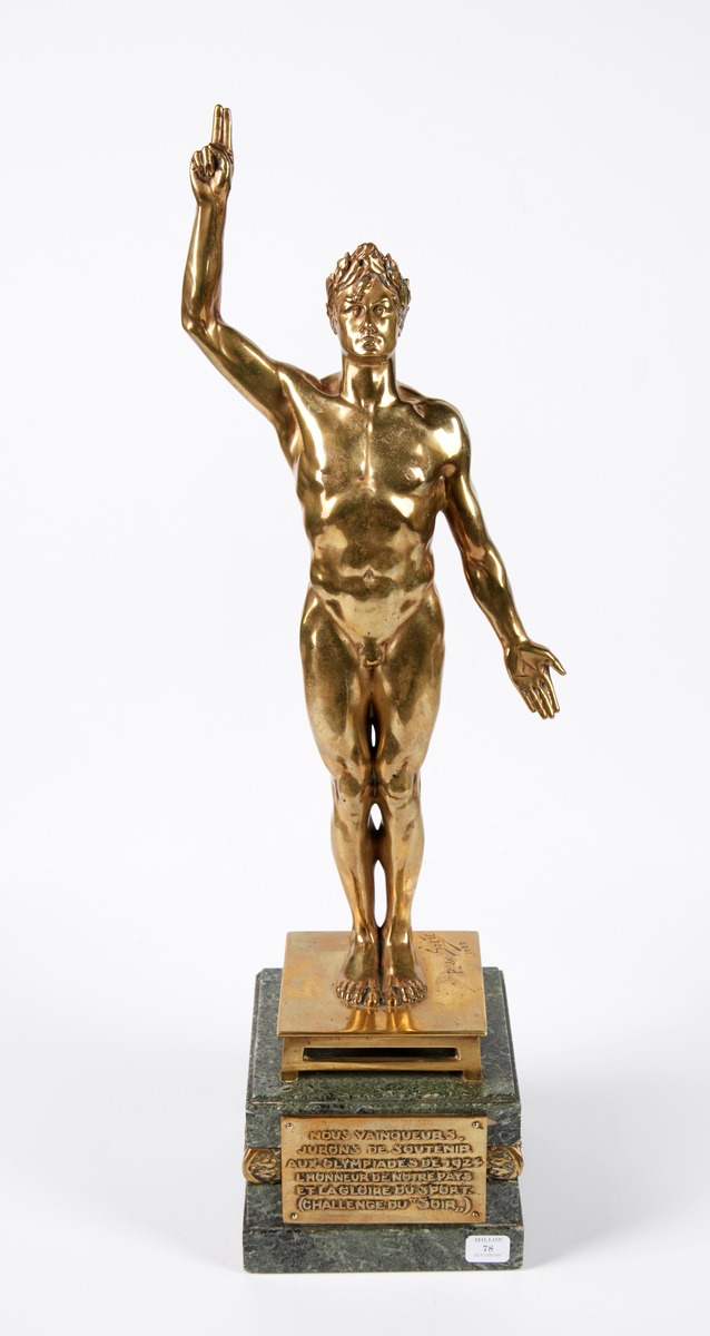 Nude male athlete taking an oath. Signature of the artist. The base is decorated with an Art Deco frieze. Caption on the plaque: "Nous vainqueurs, jurons de soutenir aux Olympiades de 1924 l'honneur de notre pays et la gloire du sport. (Challenge du "soir")."