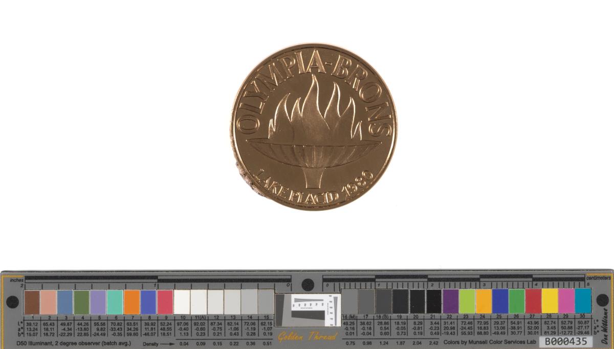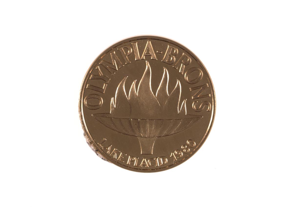 Obverse: basin containing the Olympic flame and caption: "OLYMPIA{-}BRONS ; LAKE PLACID 1980". Reverse: Olympic symbol and caption: "SVERIGES OLYMPISKA KOMMITTEE". Signed on the lower part: SPORRONG.