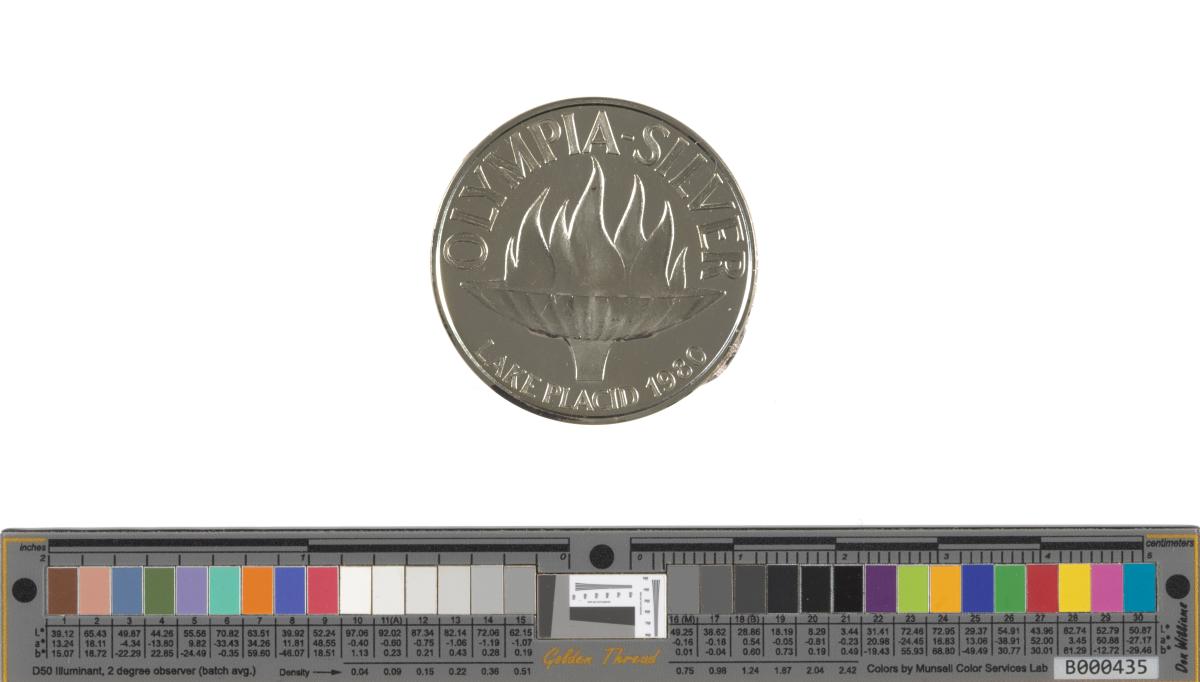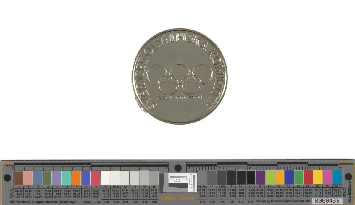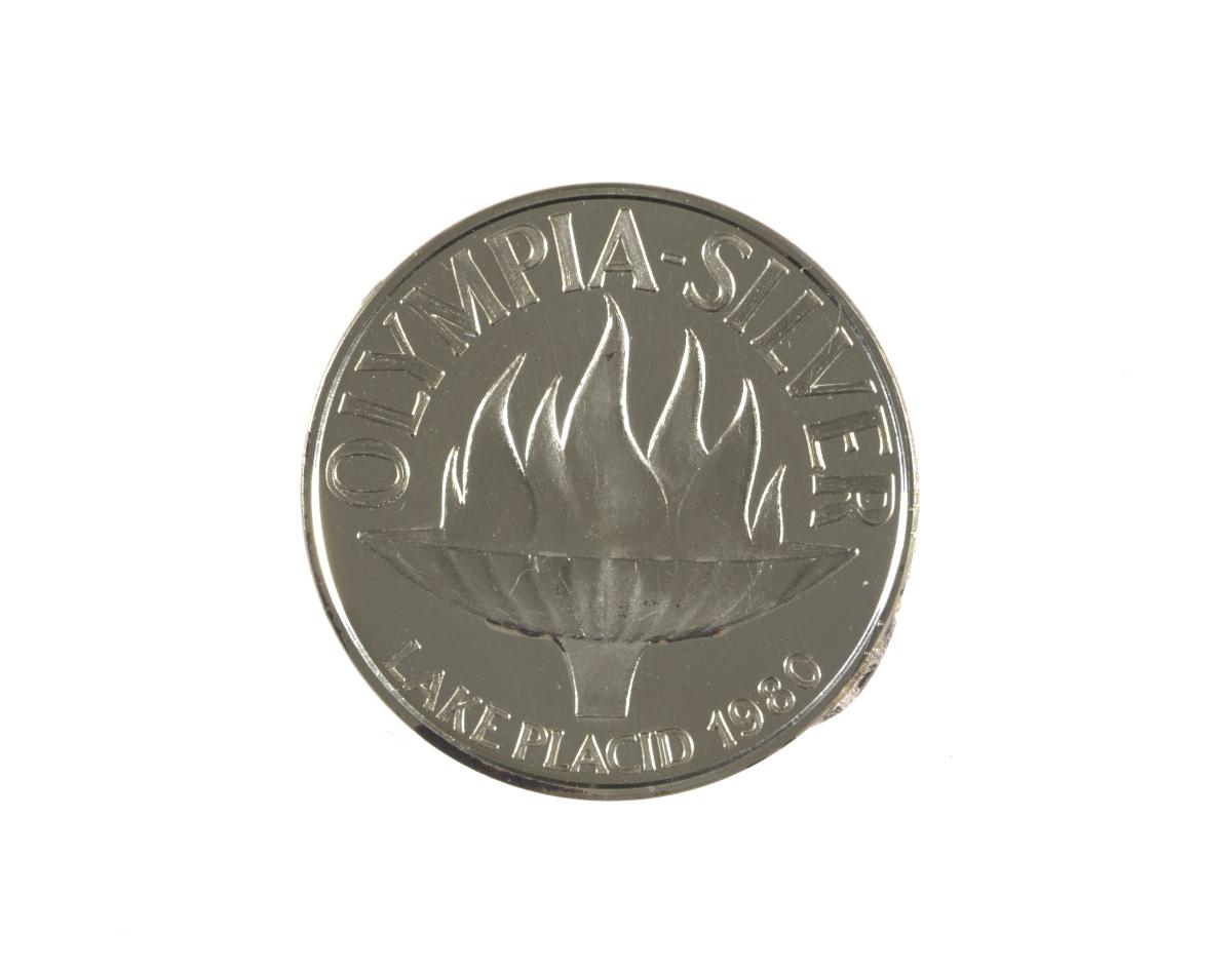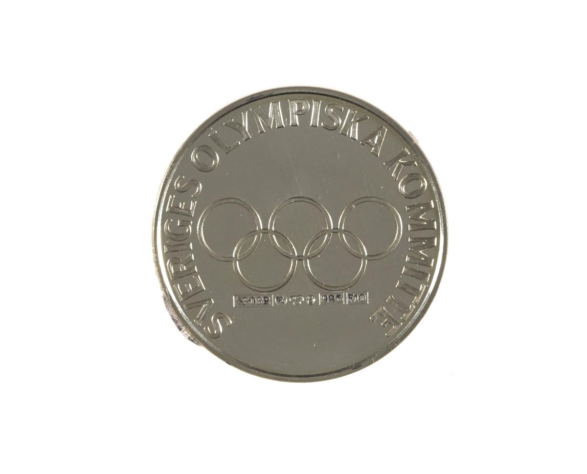 Obverse: basin containing the Olympic flame and caption: "OLYMPIA{-}SILVER ; LAKE PLACID 1980". Reverse: Olympic symbol and caption: "SVERIGES OLYMPISKA KOMMITTEE". Hallmarks.