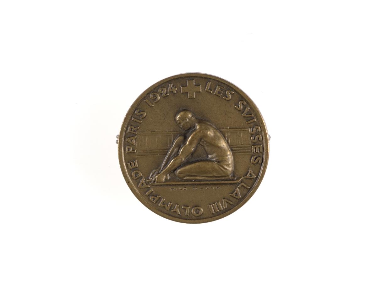 Round badge with an athlete tying the lace of his shoe, Swiss Cross and caption: "Les Suisses à la VIII Olympiade Paris 1924".