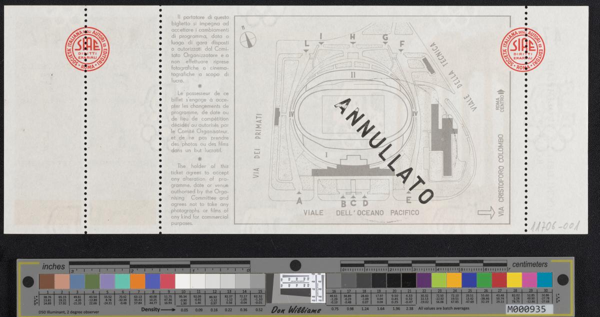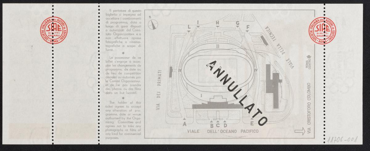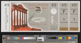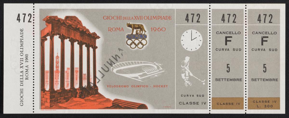 Ticket No. 472 of September 5th to attend hockey events. Illustration of the Temple of Saturn in the foreground, Olympic velodrom and Games' emblem. Text: "GIOCHI DELLA XVII OLIMPIADE / ROMA 1960 / VELODROMO OLIMPICO - HOCKEY" and "ANNULLATO" overprinted. On the back we find the map of the Olympic velodrom in Rome.