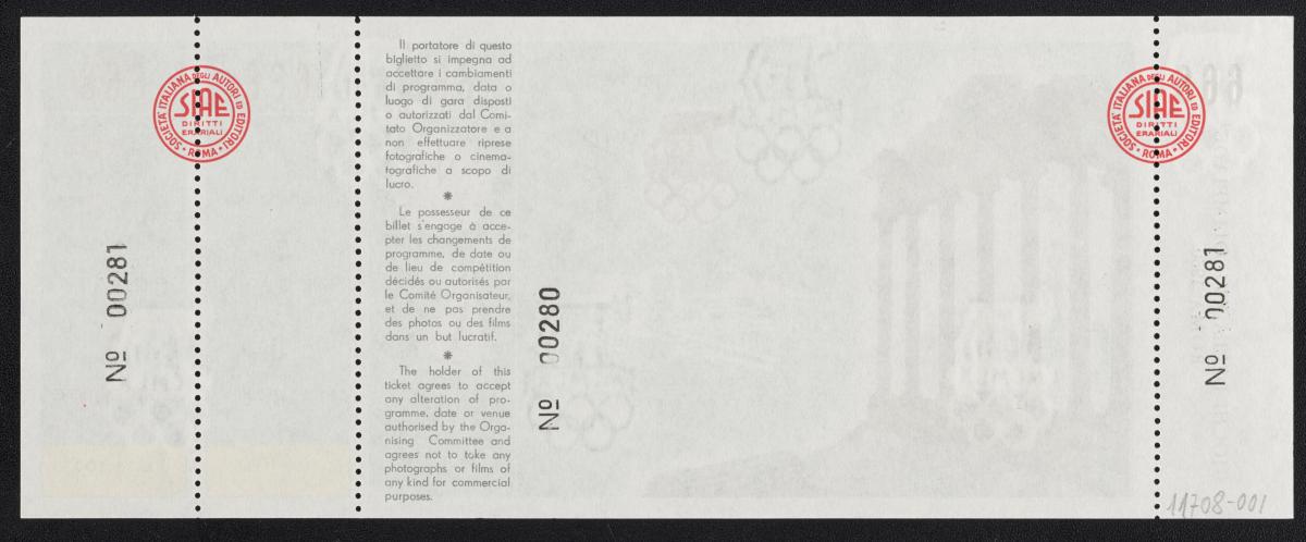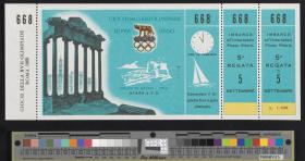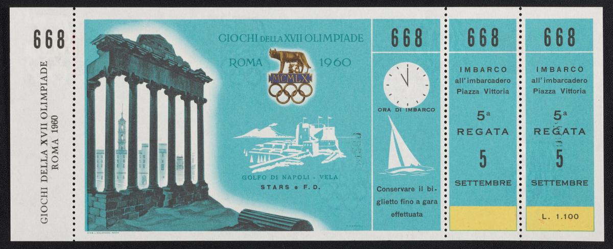 Ticket No. 668 of September 5th to attend sailing events. Illustration of the Temple of Saturn in the foreground, Bay of Naples and Games' emblem. Text: "GIOCHI DELLA XVII OLIMPIADE / ROMA 1960 / GOLFO DI NAPOLI - VELA".