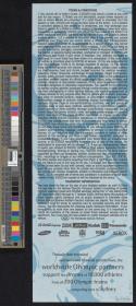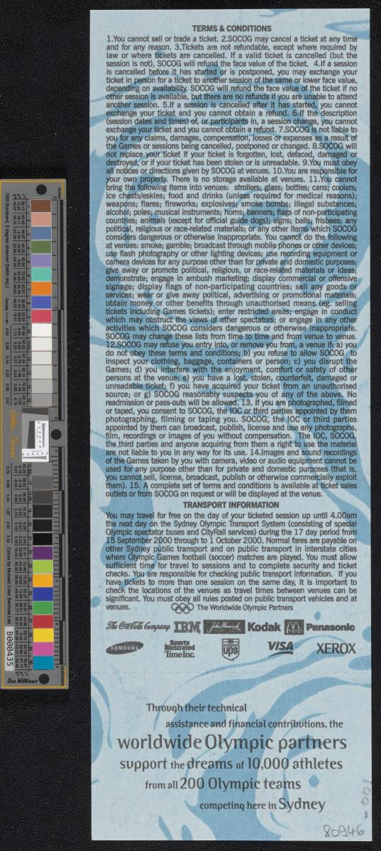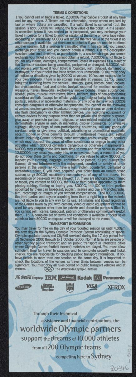 Admission ticket with the Games emblem and pictogram of the sport. Place and location of the seat. On the back conditions and list of top sponsors.
